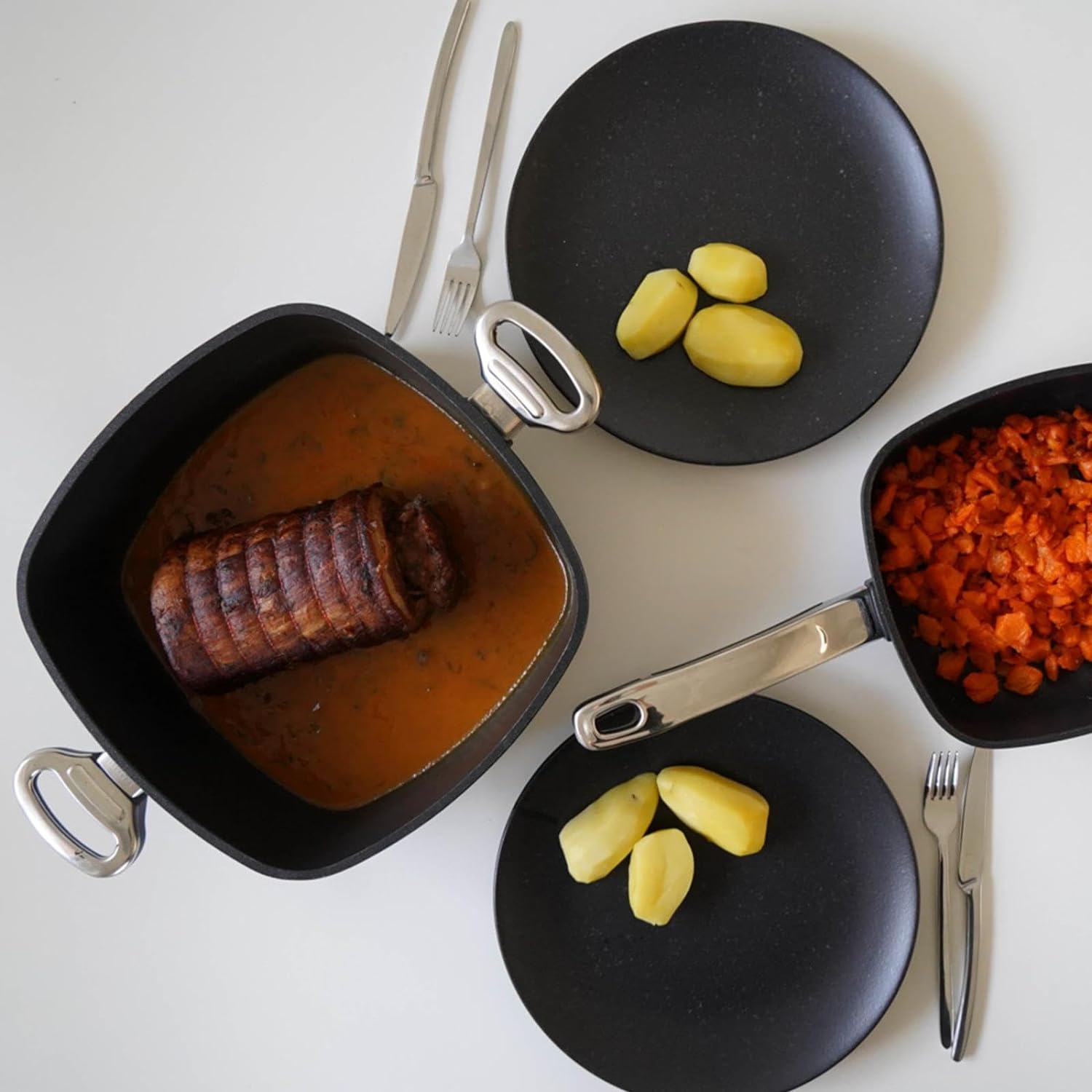- Die viereckige robuste induktionsgeeignete Hochrandpfanne zum Braten, Anbraten und Schmoren kann auf allen Herdarten wie Gasherden, Elektroherden und induktiven Glaskeramikkochfeldern genutzt werden