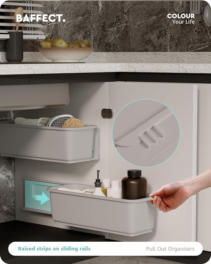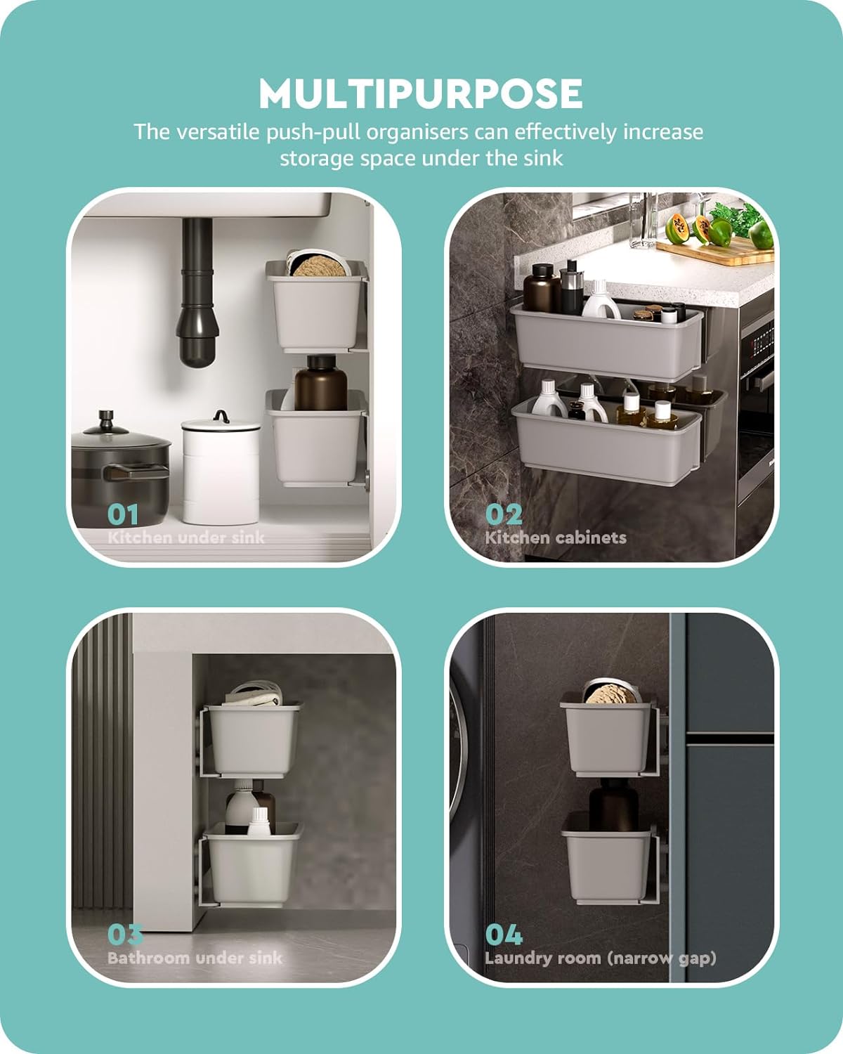 - Multifunktionale Aufbewahrung: Die ausziehbaren Schrankkorb-Organizer eignen sich perfekt für Ihre Küchenschränke zur Aufbewahrung von Gewürzen und Frischhaltefolien, für Ihr Unterbecken zur Aufbewahrung von Reinigungsprodukten, für die Arbeitsplatte im Badezimmer zur Aufbewahrung der Badlieferanten oder für den Schreibtisch zur Aufbewahrung des Briefpapiers.