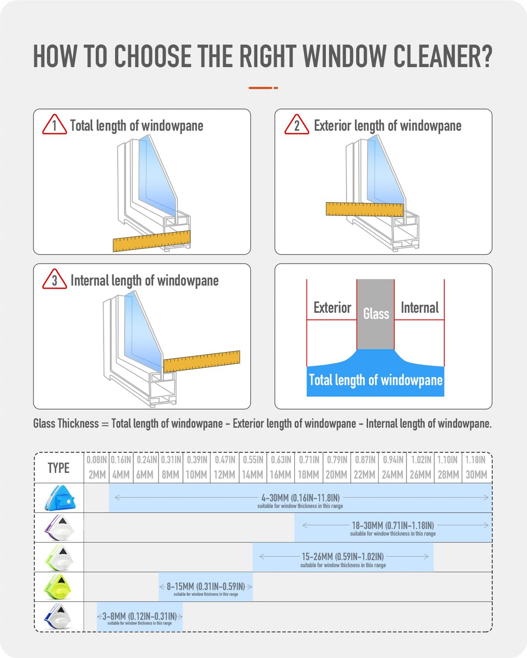 - Produktgrösse (L x B x H): 16 x 13,5 x 7 cm. Der Fensterreiniger eignet sich für Einzel- und Doppelverglasungen mit einer Gesamtstärke von 15-26 mm und nicht für Dreifachverglasung. Wenn Sie sich nicht sicher sind, welche Dicke Ihres Fensters ist,