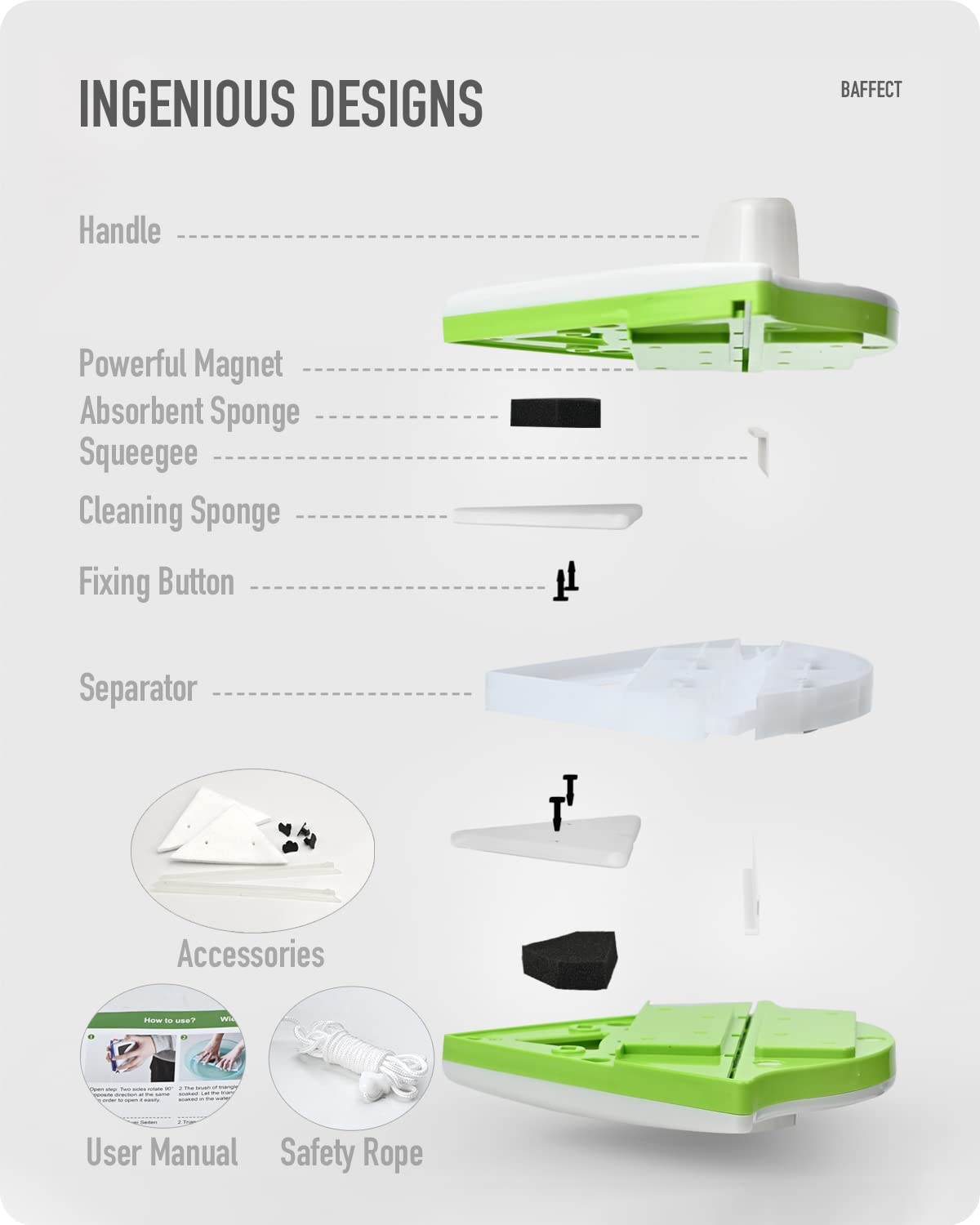 - Starke Saugfähigkeit: Der Fensterreiniger von Baffect ist effektiv für Einzel- und Doppelverglasungsdicke 15–26 mm. Bitte stellen Sie sicher, dass Ihre Fensterstärke innerhalb von 15-26 mm liegt. Sie können die Innen- und Aussenseite des Fensters