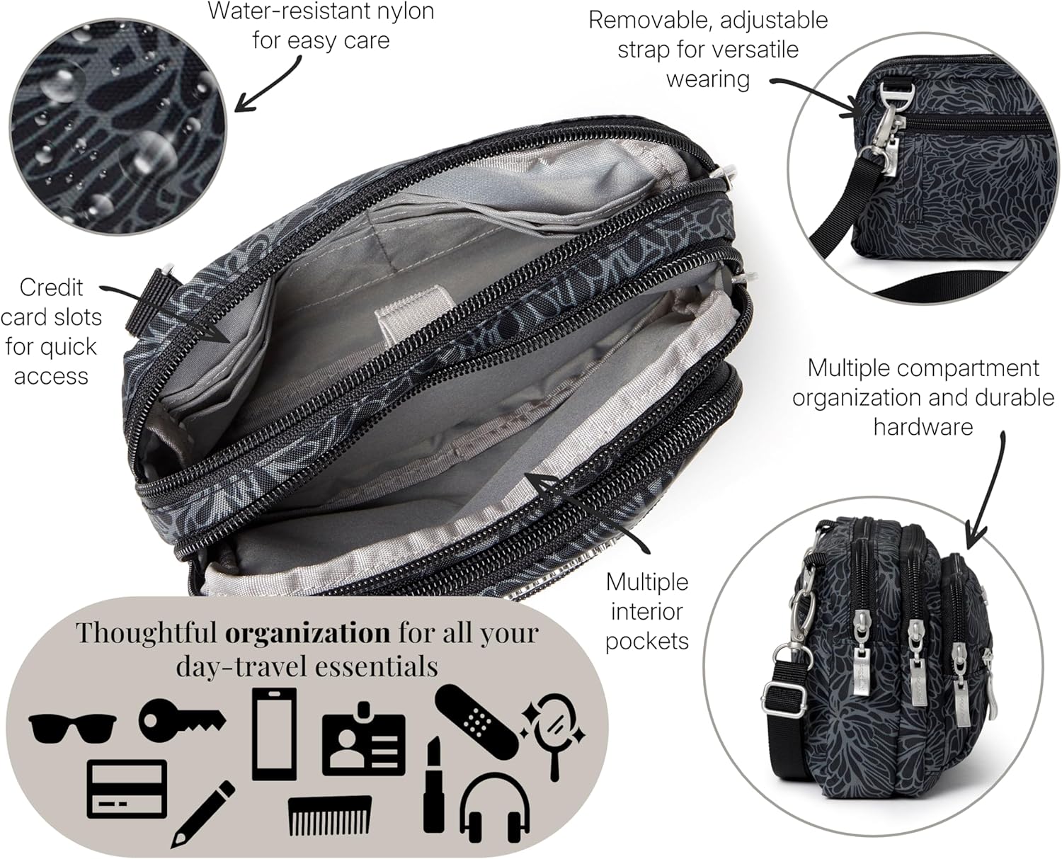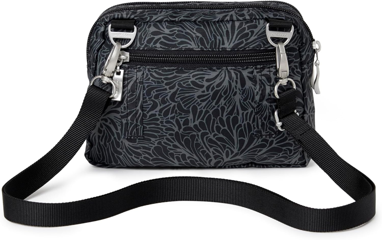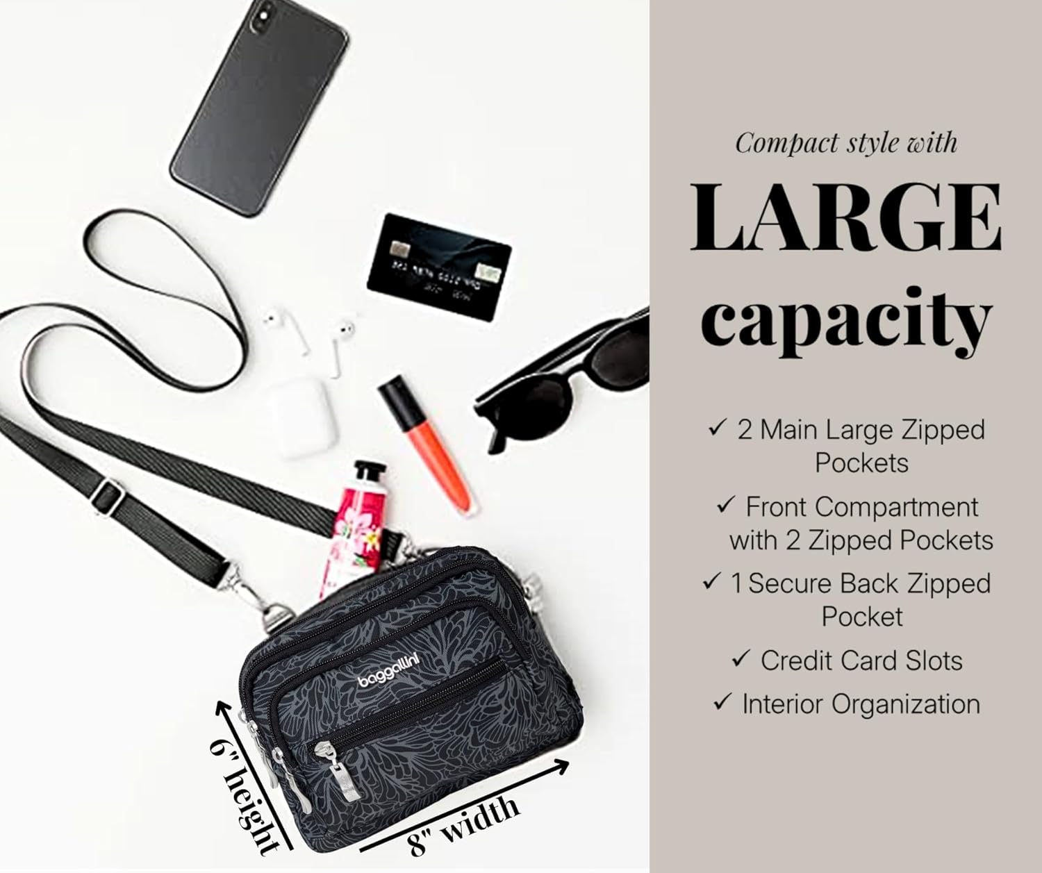 PRODUKTBESCHREIBUNGEN Vielseitigkeit ist der Name des Spiels mit der Triple Zip Tasche von Baggallini. Dank eines abnehmbaren 132,1 cm verstellbaren Riemens funktioniert unsere leichte Reisetasche als Crossbody, Portemonnaie oder Bauchtasche. Es ist perfekt für Reisen, den täglichen Gebrauch und vieles mehr. Sechs Kreditkartenfächer und mehrere Reissverschlusstaschen halten Ihre wichtigsten Utensilien organisiert und einsatzbereit, während subtile Gürtelschlaufen die Tasche an einem Gürtel sichern kann. Ausserdem wiegt unser wasserabweisendes Design nur 227 g und ist 15,2 cm hoch, 20,3 cm breit und 5,1 cm tief. Mehr