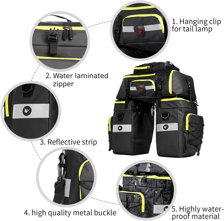 - ⭐Grosse Kapazität: 3 Fahrradtaschen sind insgesamt 75L gross und genug für Kleidung, Handschuhe, Handys, Reparaturwerkzeuge und andere wichtige Dinge. Die Fahrrad Packtaschen befreit Sie beim Radfahren von Ihrem schweren Rucksack und bietet eine