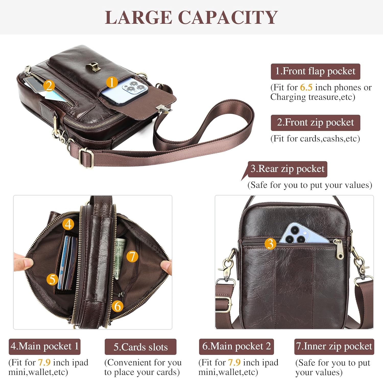 - 【Praktische Struktur】: Diese kompakte Umhängetasche für Herren verfügt über eine grosse Kapazität, insgesamt 5 Fächer: 1 vordere vertikale Reissverschlusstasche, 1 vordere Klappentasche, 2 Haupttasche mit Reissverschluss mit innerer