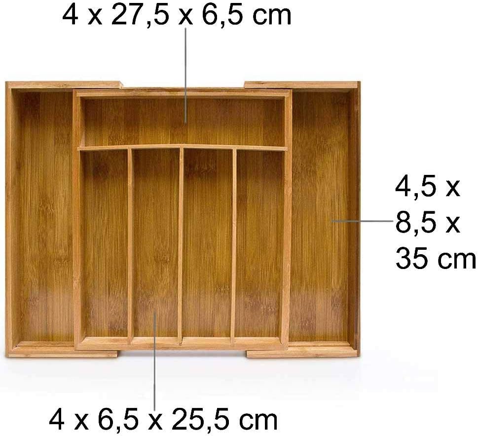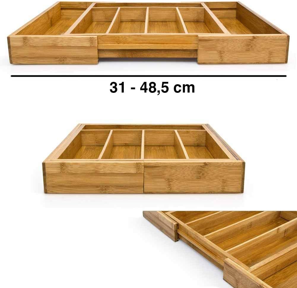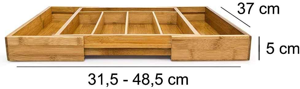 - Mit den Massen von 37 x 31 x 5 cm mit einer ausziehbaren Länge von bis zu 48,5 cm (37 x 48,5 x 5 cm) ist dieser Besteckkasten ein hochwertiges Küchenzubehör, das Ihre Küche funktionaler macht und Ihnen dabei hilft, alles ordentlich und griffbereit zu