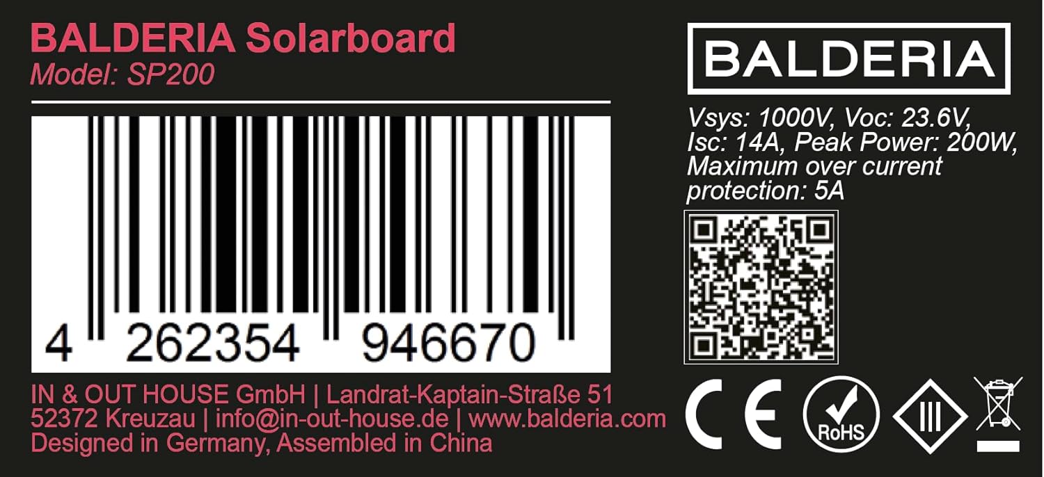 - KLIMANEUTRALE NUTZUNG | Durch den Einsatz des BALDERIA Solarboard SP200 wird garantiert nachhaltiger Strom erzeugt. Grüner Strom überall produzierbar und überall nutzbar. Die Leistungsfähigkeit der Solarzell-Pakete bleibt über die Zeit konstant.