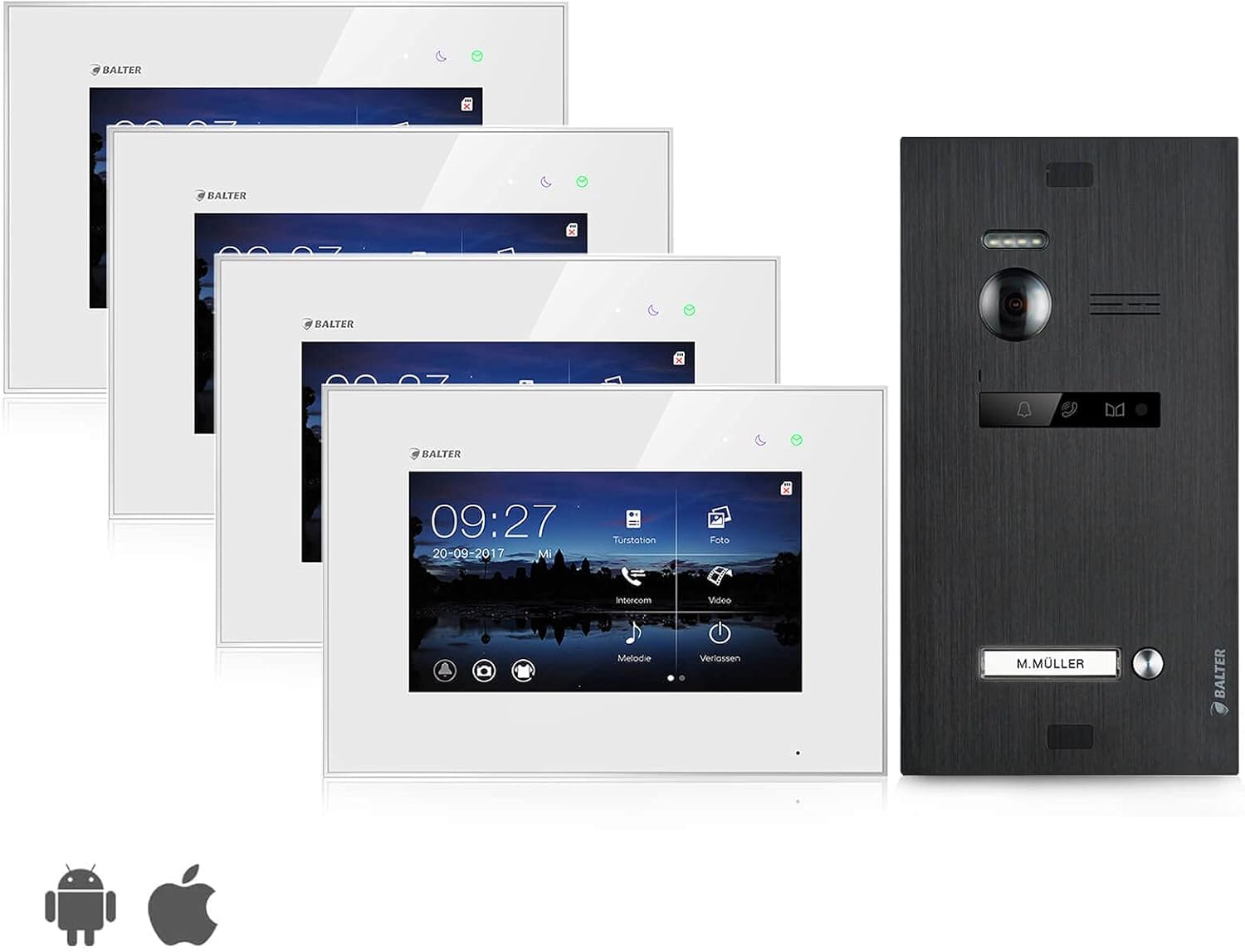 - ✔ KOMPLETTSET FÜR 1 Familienhaus: Mit diesem Komplettset rüsten Sie Ihr Einfamilienhaus im Handumdrehen mit einer leistungsstarken Video Türsprechanlage aus. Das EVO Komplettpaket besteht aus vier 7“ Monitore mit Touchscreen-Display, einer zeitlos