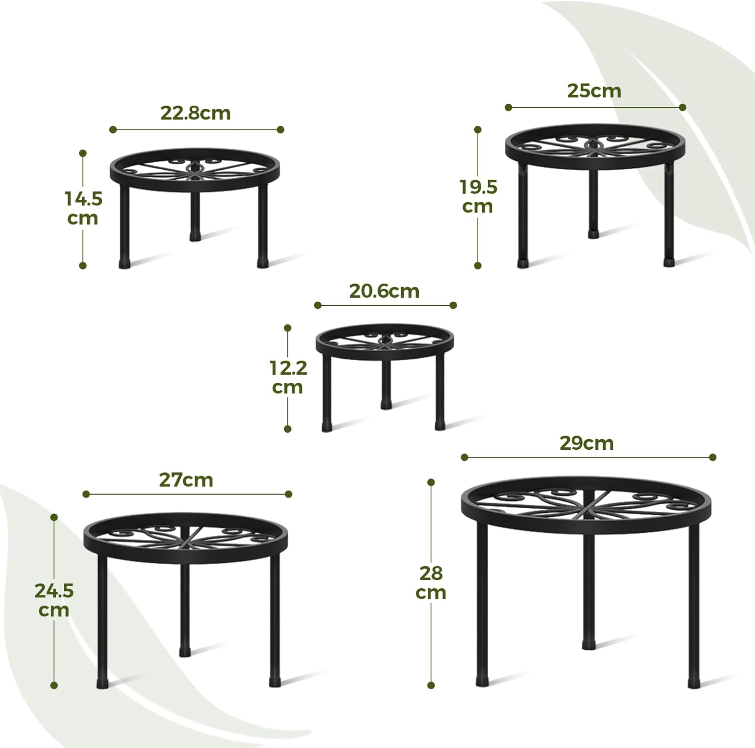 - ✿【Multiple Sizes】5 verschiedene Grössen von Metall-Pflanzenständern (28cm/25cm/23cm/20cm/17cm) sind aus hochwertigem Metall gefertigt und mit vier Stützpunkten entworfen, sehr robust und stabil. Pflanzenregale können Lasten von bis zu 50kg