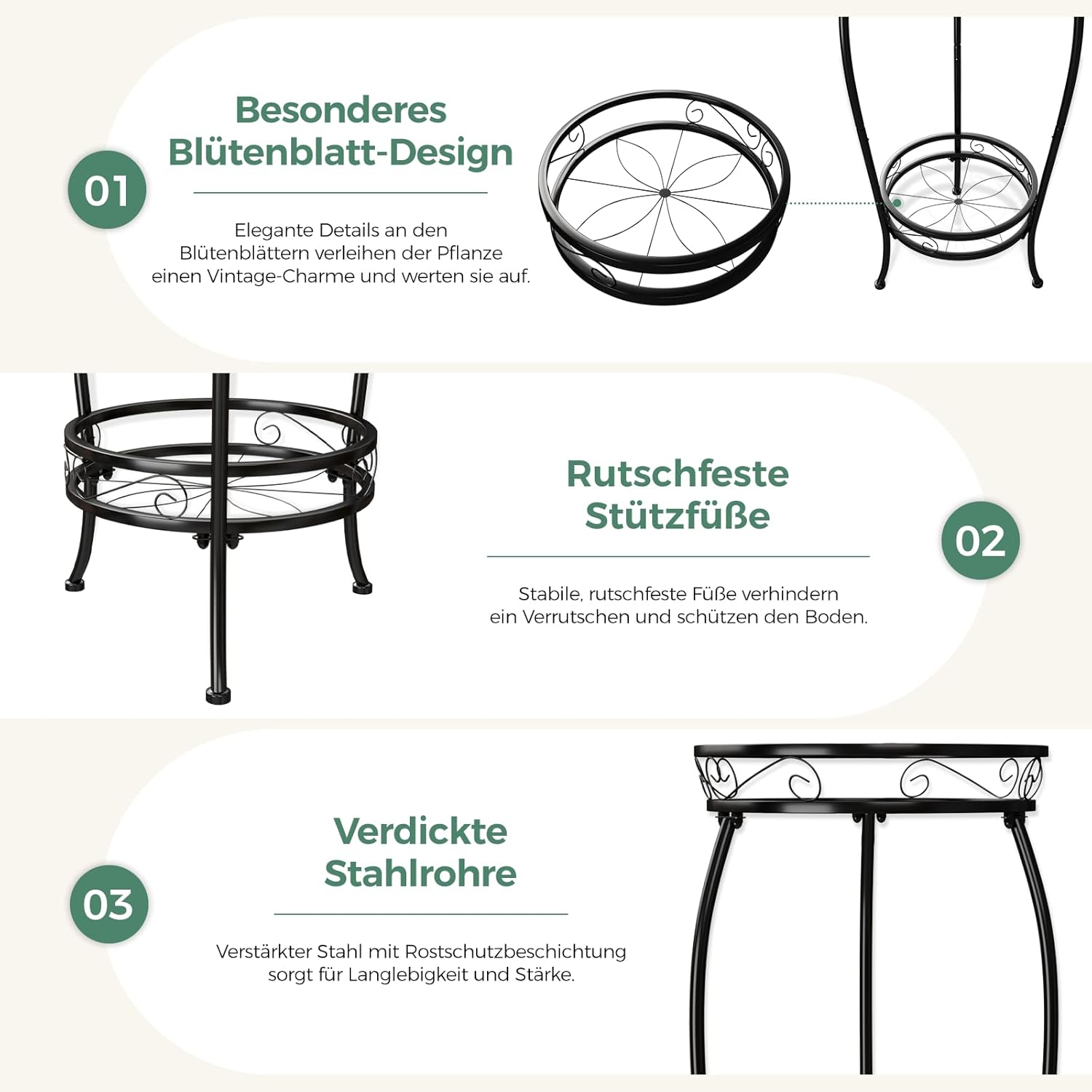 - Sicherheit und Stabilität - Der Sockel mit integrierter 3-Bein-Struktur macht den Blumenständer stabiler und hält das Gleichgewicht für eine lange Zeit, wir haben überprüft, dass der Pflanzenständer 50KG tragen und kontinuierlich arbeiten kann.