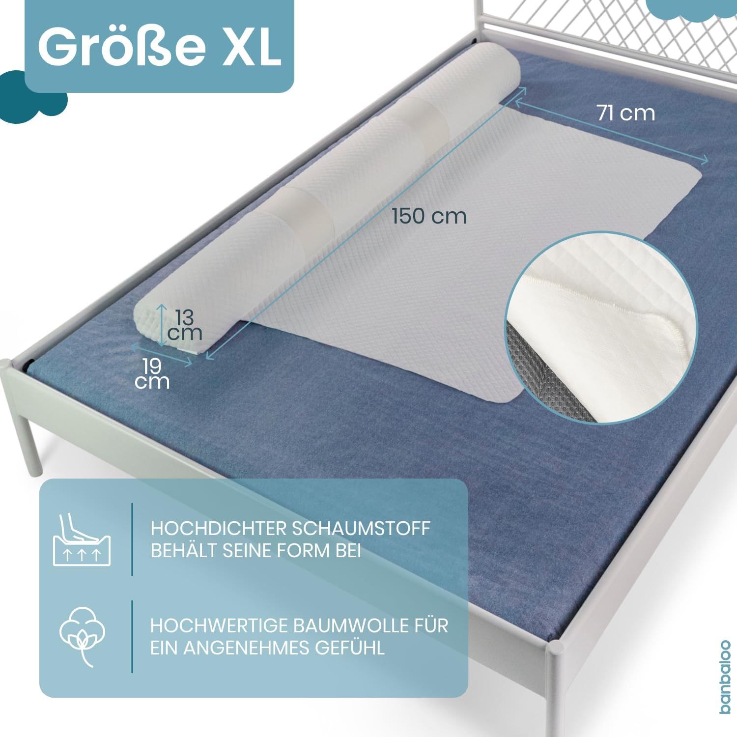 • DESIGN: Banbaloo Max verfügt ausserdem über eine flache Verlängerung aus gepolsterter und wasserdichter Baumwolle, welche das Gewicht des Kindes dazu nutzt, den Balken am Bett zu fixieren. Gleichzeitig bedeckt sie eine Bettbreite von 90 cm und kann somit als Matratzenschutz genutzt werden. 150x90x13cm ideale Masse für eine effektive Funktionsweise. Das bietet kein anderes Stillkissen oder -polster. Es wird in einer fantastischen Reissverschlusstasche geliefert.