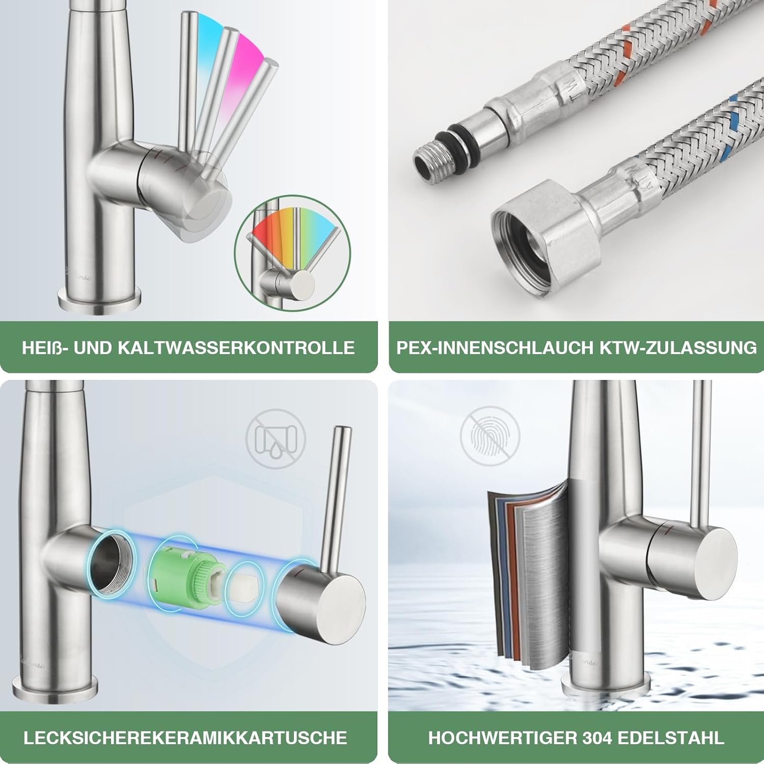- Hochwertige Materialien:Unsere Armatur verfügt über hochwertige Keramikdichtungen,Nach 500.000 strengen Tests,langlebig.Wasserzu Schläuche verfügt über einem KTW zertifizierten.Gesundheit und Sicherheit