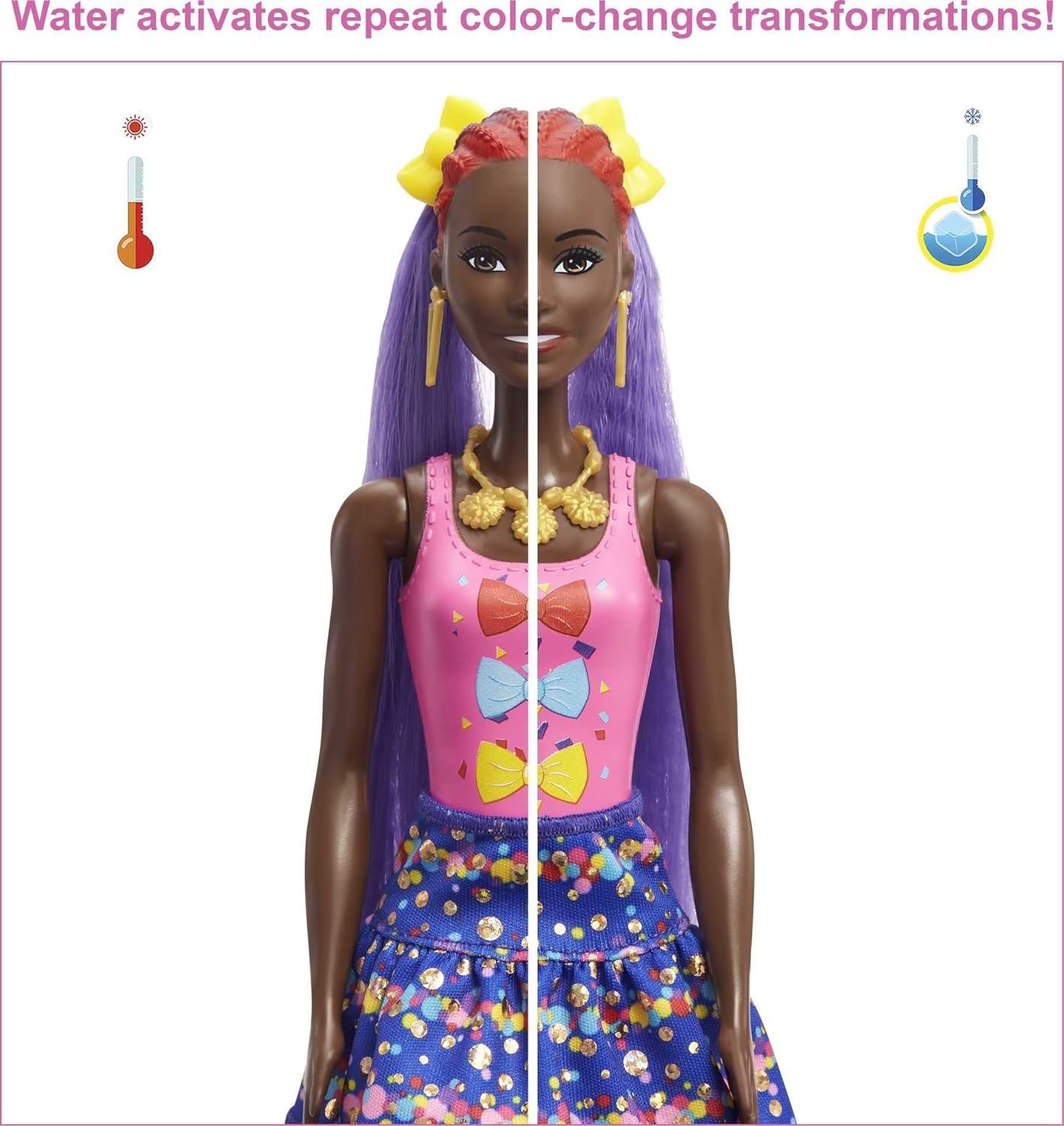 - Um die geheimnisvolle Puppe zu enthüllen, den Behälter mit warmem Wasser füllen, die Puppe hineintauchen hin und her drehen, Das Wasser nimmt wie von Zauberhand einen glitzernd blauen Farbton an Die Puppe herausnehmen und ihren neuen Look bewundern - sie trägt einen Body mit lustigem Schleifchen Aufdruck