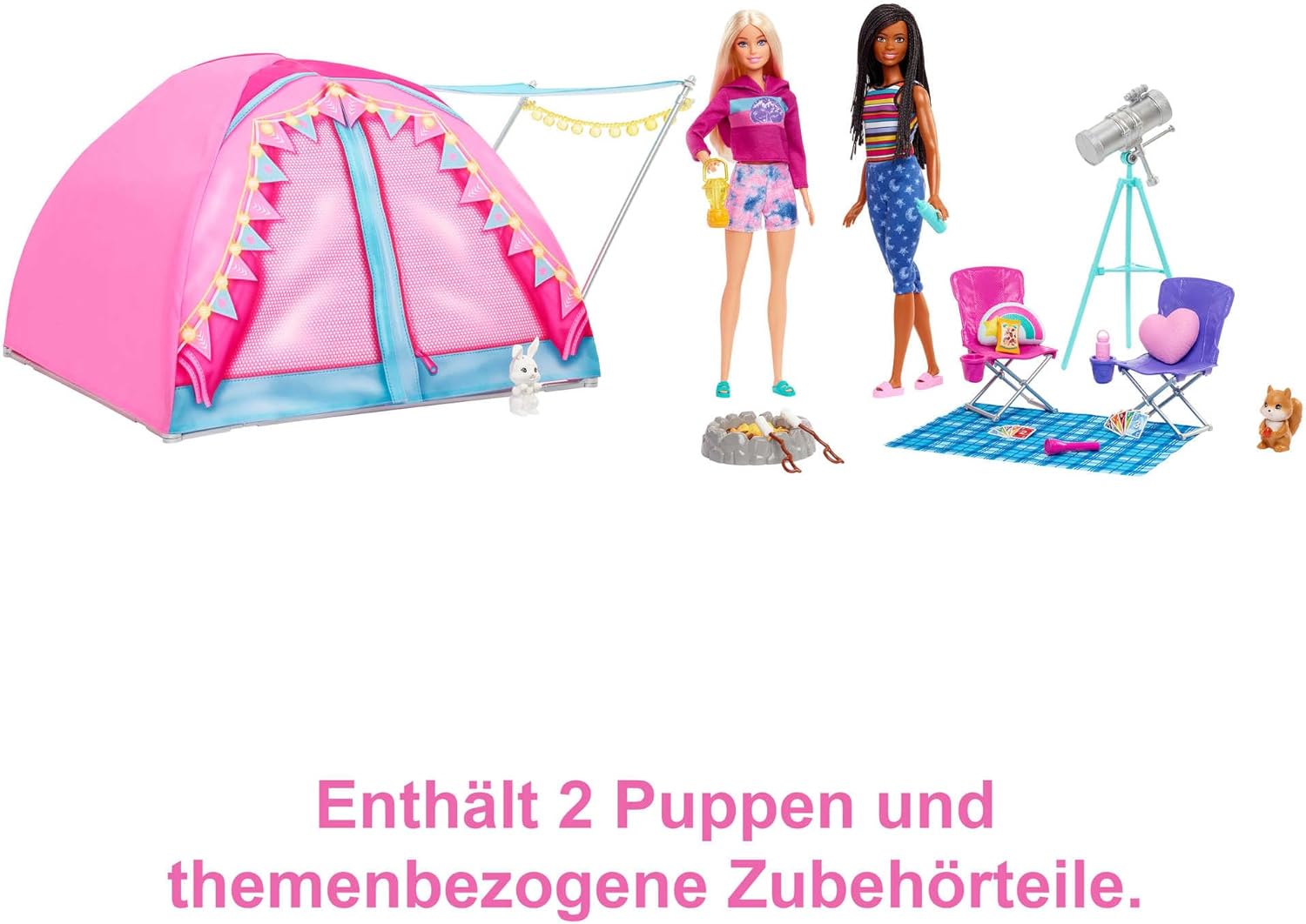 - Dieses Barbie Abenteuer zu zweit“ Camping-Spielset mit Barbie Malibu- und Barbie Brooklyn Roberts-Puppen sowie allem, was die zwei besten Freundinnen brauchen, um den ultimativen Campingplatz zu errichten, inspiriert Kinder zu Abenteuer im Freien.