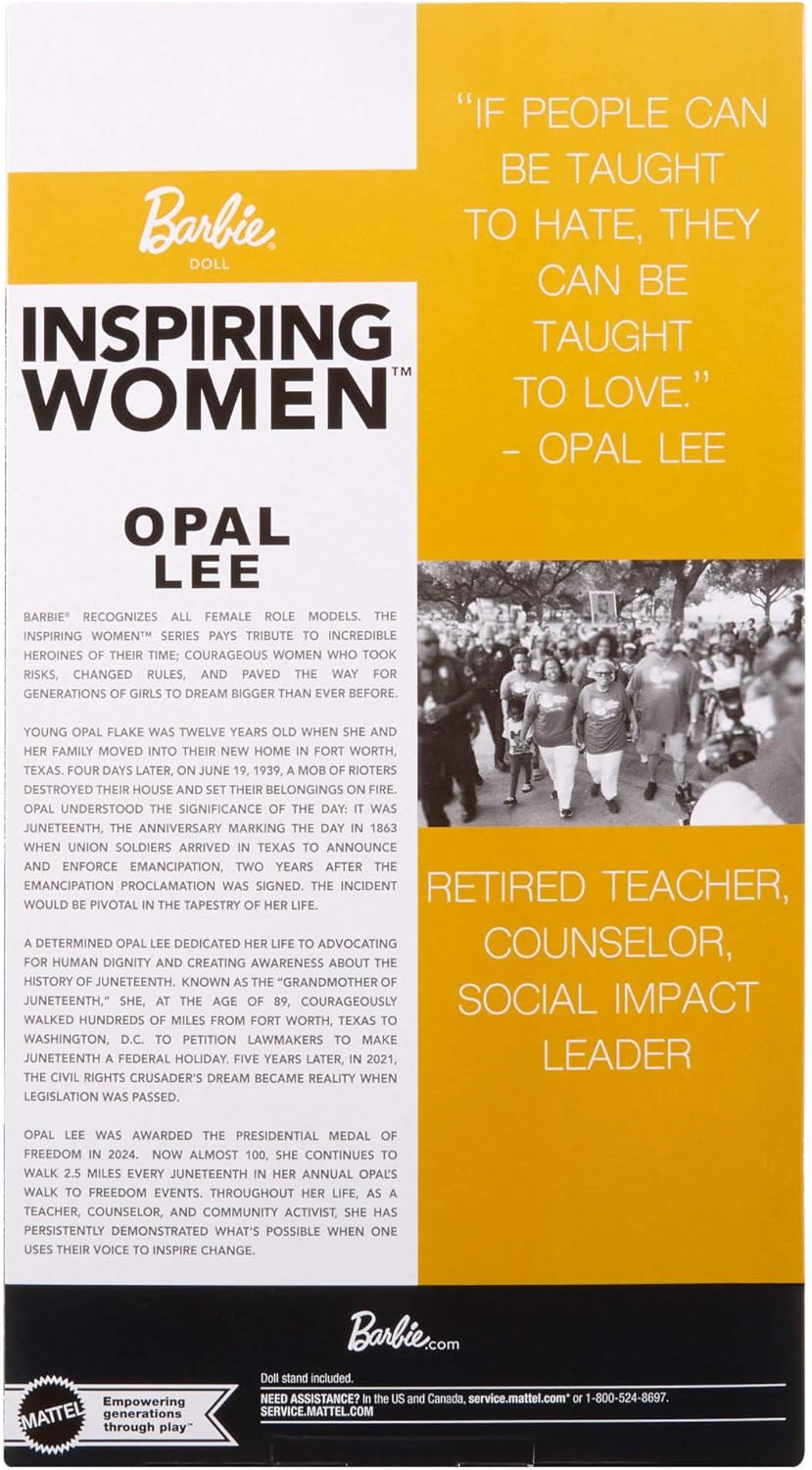 - Die Opal Lee Inspiring Women Barbie-Puppe kommt in einer Verpackung zum Präsentieren und ist ein ideales Geschenk, das jahrelang gewürdigt werden kann.