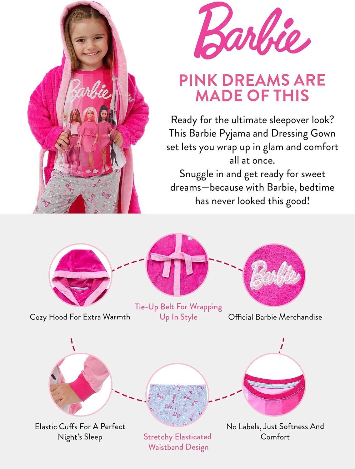 - Offiziell lizenziertes Barbie-Merchandise. Ein pinkes Schlafanzug- und Morgenmantel-Set für Kinder mit Barbie und Freunden