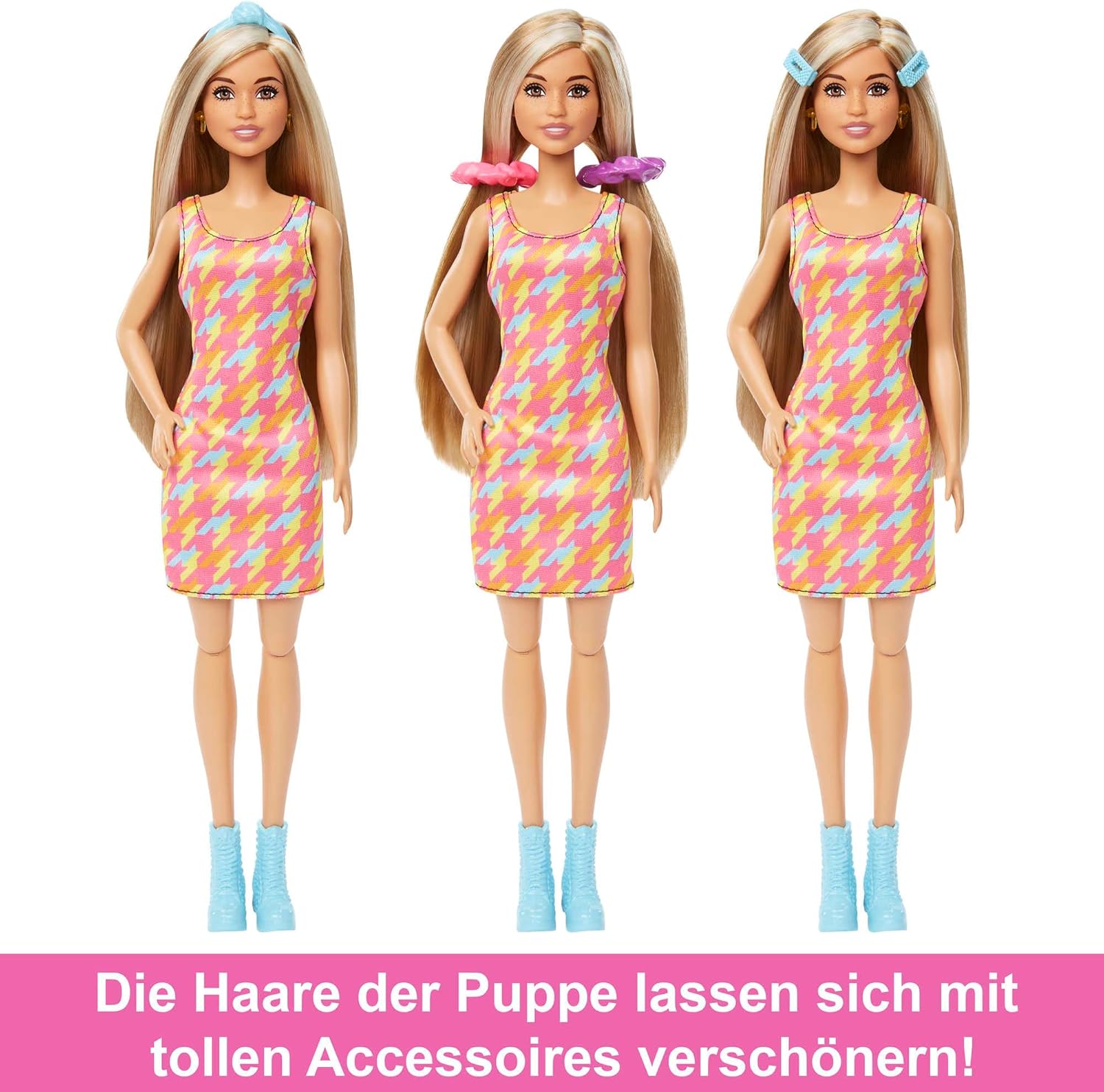 - Die Barbie-Puppe hat circa 15 cm lange Haare mit Farbwechseleffekt, die zum Spielen einladen. Sie trägt ein buntes Kleid mit Rapportmuster und blaue Stiefel.