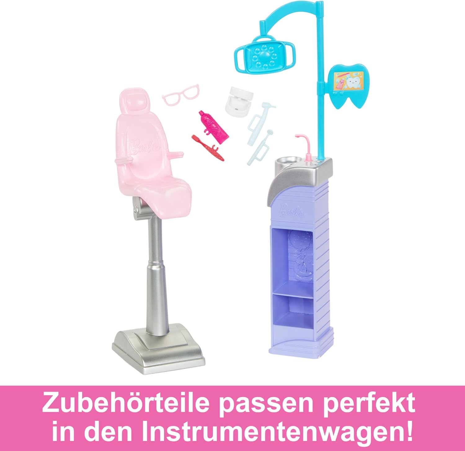 - Dieses Spielset umfasst 2 Puppen, einen Instrumentenwagen, einen Behandlungsstuhl und kleinere Zubehörteile wie Zahnarztinstrumente, Zahnbürste und Zahnpasta.