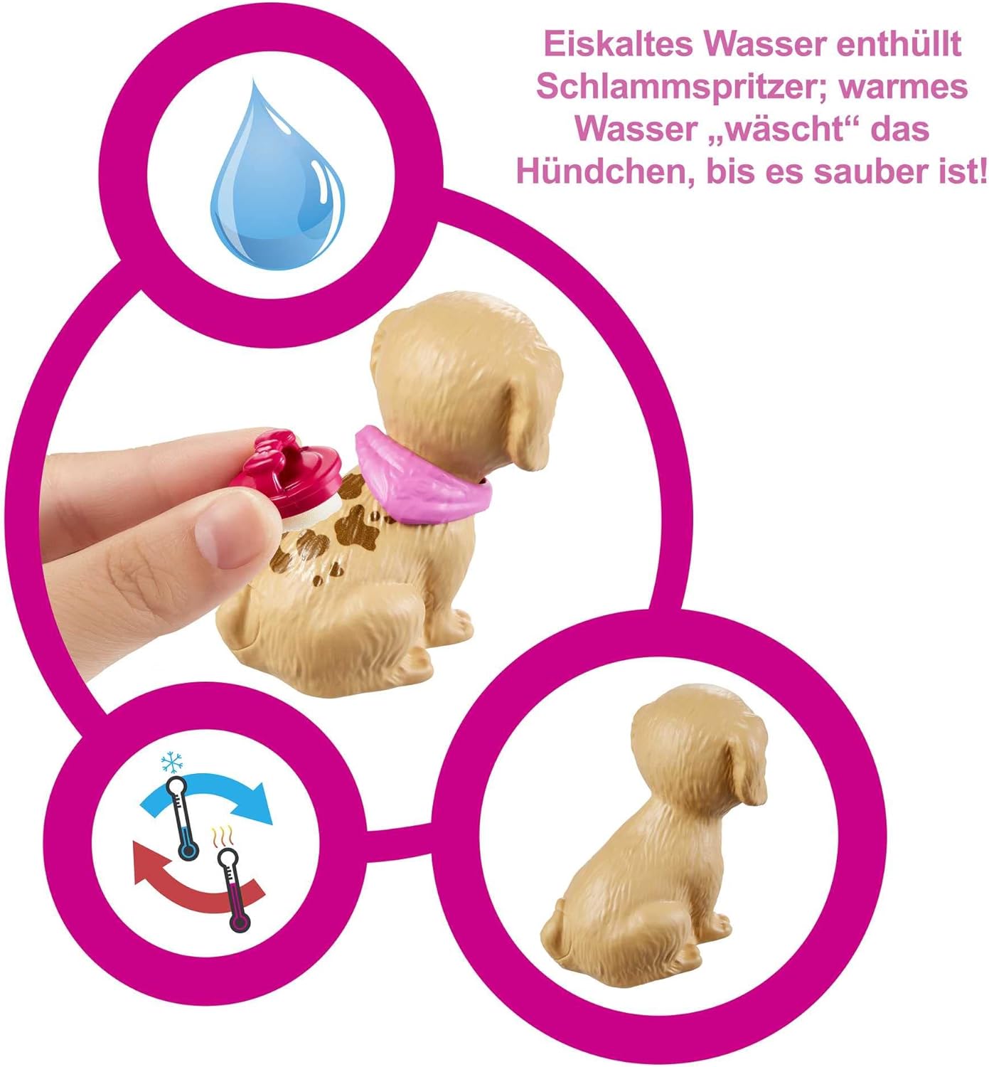 - Um den Farbwechseleffekt des Hündchens zu aktivieren, den beiliegenden Schwamm und kaltes und warmes Wasser verwenden. Dann können Kinder beobachten, wie die Schmutzflecken des Hündchens verschwinden und wieder auftauchen.