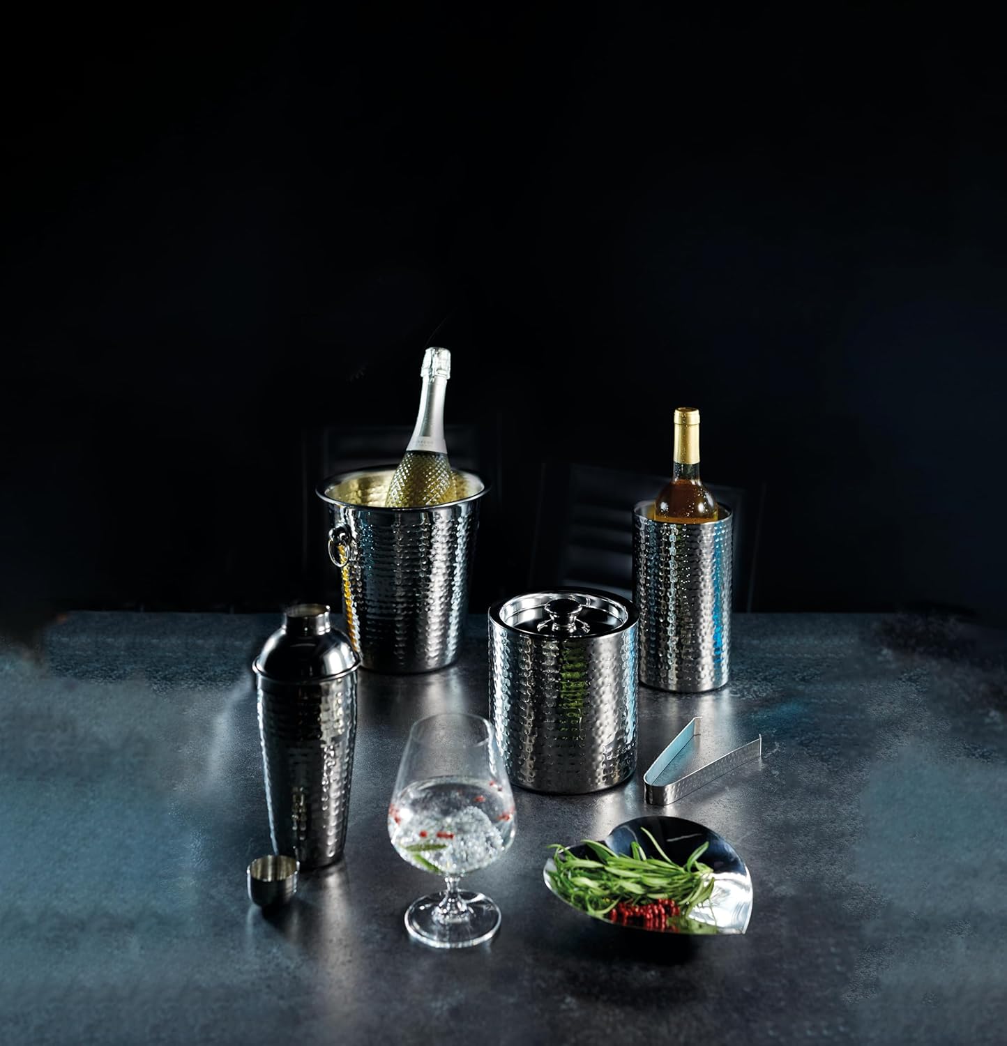- Celebrate In Style - Dieser Eiskübel ist aus Edelstahl gefertigt und hat eine atemberaubende, gehämmerte Struktur, in der sich das Licht reflektiert und in den Prägungen bricht