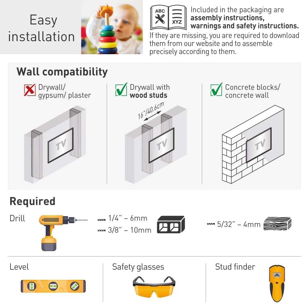 - ► SCHNELLE UND EINFACHE INSTALLATION - Im Lieferumfang sind neben dem Standard-Montagematerial eine detaillierte Installationsanleitung. Das hilft Ihnen, diese TV Wandhalterung ohne Probleme zu installieren. Sie kann an massiven Betonwänden,