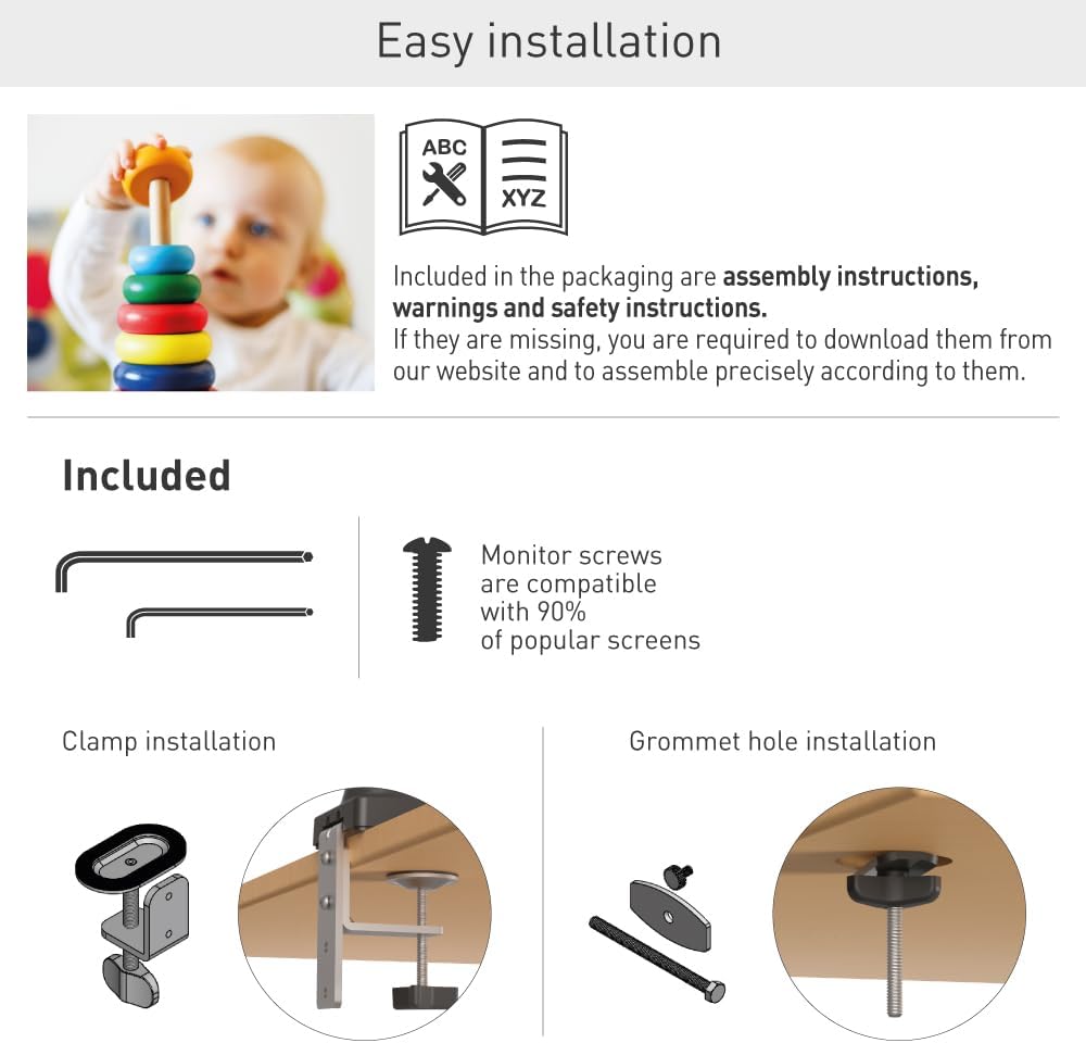 - ► 2 MONTAGEOPTIONEN - Dieser einzelarmige Monitorständer wird mit einer C-Klemme und einem Tüllenmontagesatz geliefert. Sie können den Monitor halter befestigen und Ihren Monitor mit der C-Klemme halten (max. Tischdicke 9 cm). Wenn sich in Ihrem