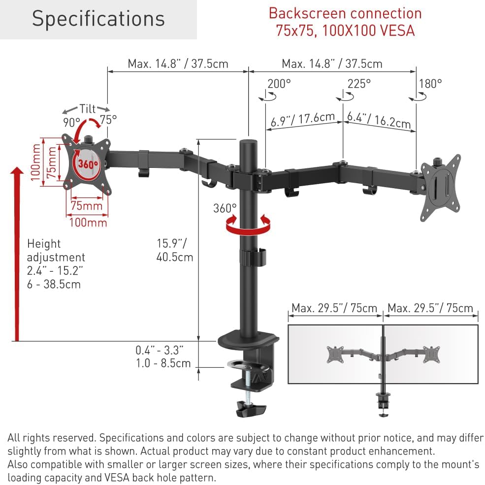 - ► DOPPELARM-MONITORHALTERUNG - Montage von zwei Bildschirmen nebeneinander, um Platz auf dem Schreibtisch zu schaffen. Für zwei 13-29 zoll Monitore mit einer maximalen Tragfähigkeit von 5Kg pro Arm und VESA-Grössen von 75 x 75 mm oder 100 x 100 mm.