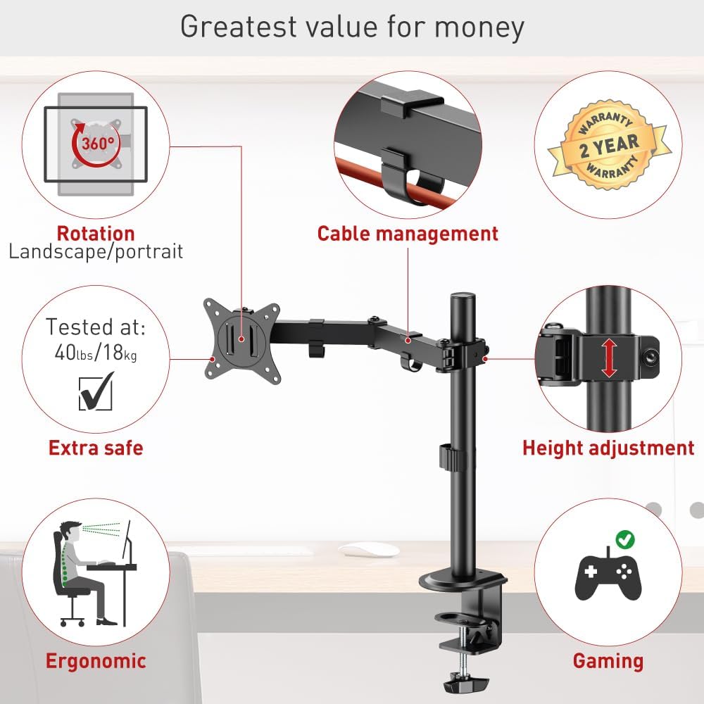- ►UNIVERSELLE KOMPATIBILITÄT - Unsere einarmige Bildschirmhalterung ist für die meisten Monitore bis zu 32 Zoll mit VESA-Massen von 75 x 75 mm und 100 x 100 mm geeignet. Max. Tragfähigkeit bis zu 6.5Kg.