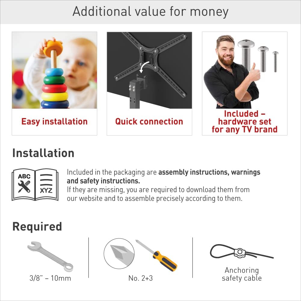 - ► FUNCTIONALITY - To provide a better point of view, the stand has 3 height adjustment options, swivels near the screen connection plate 90° and has a tool-free tilt from 0° till 10°.