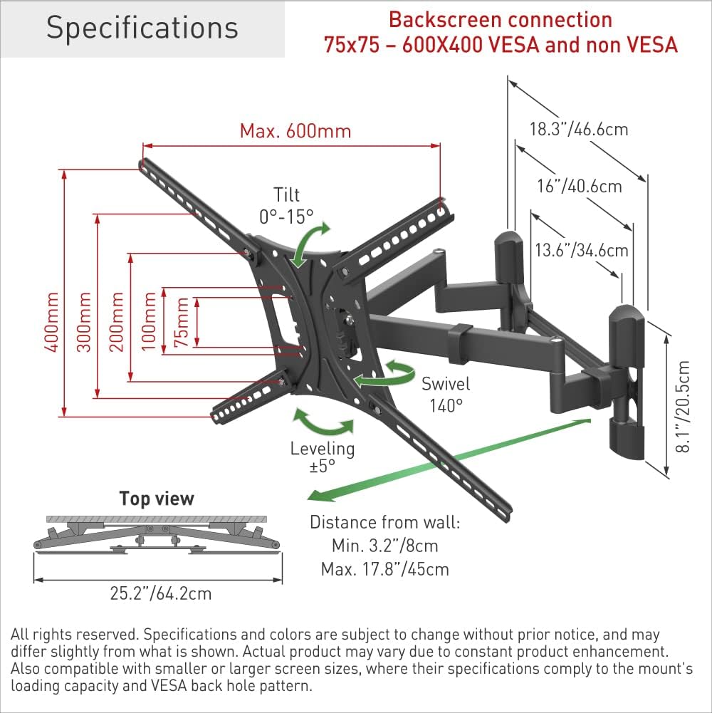 • ► FEATURES - The TV mount fits most 13-90" TVs up to 60kg. Fits TVs with VESA standard (Bracket Mounting Holes Patterns) 75x75, 100x100, 100x200, 200x100, 200x200, 300x300, 300x400, 400x200, 400x300, 400x400, 600x400 mm and non VESA up to 600x400 mm.