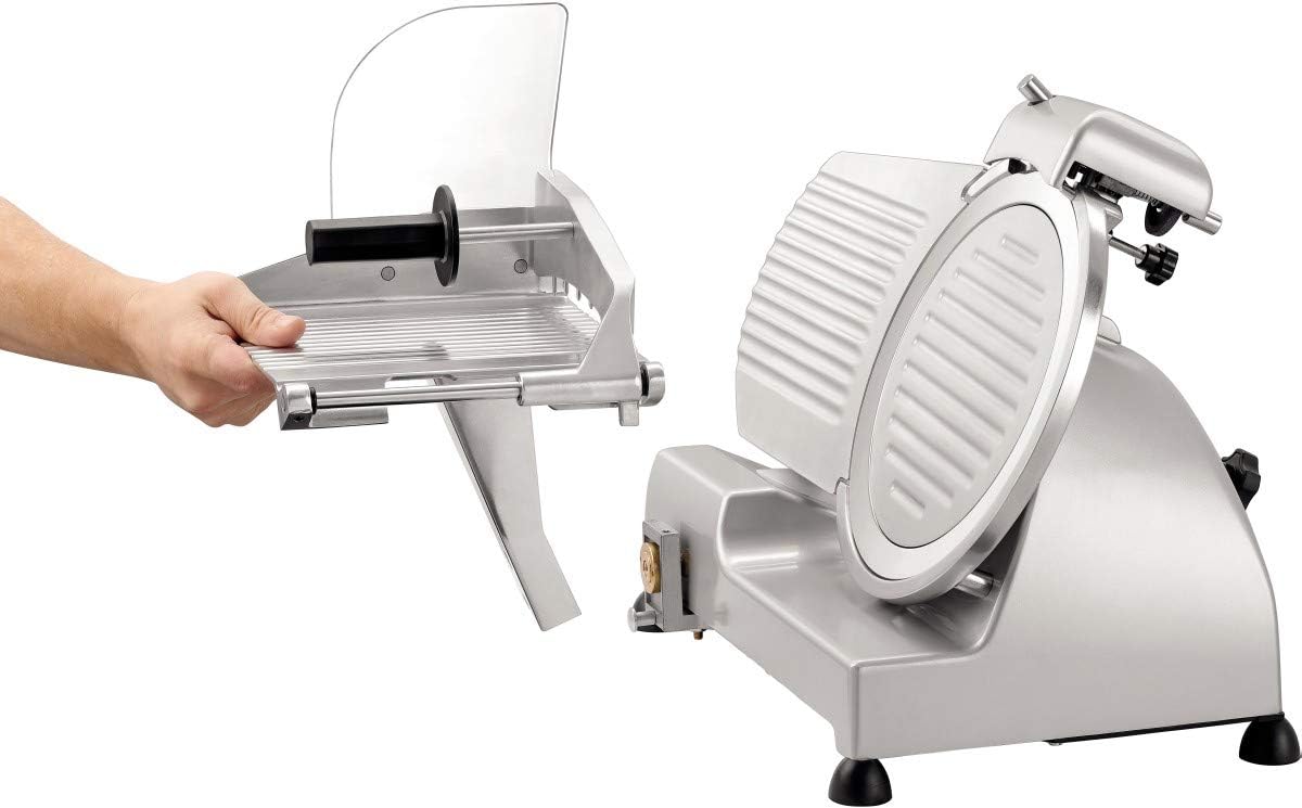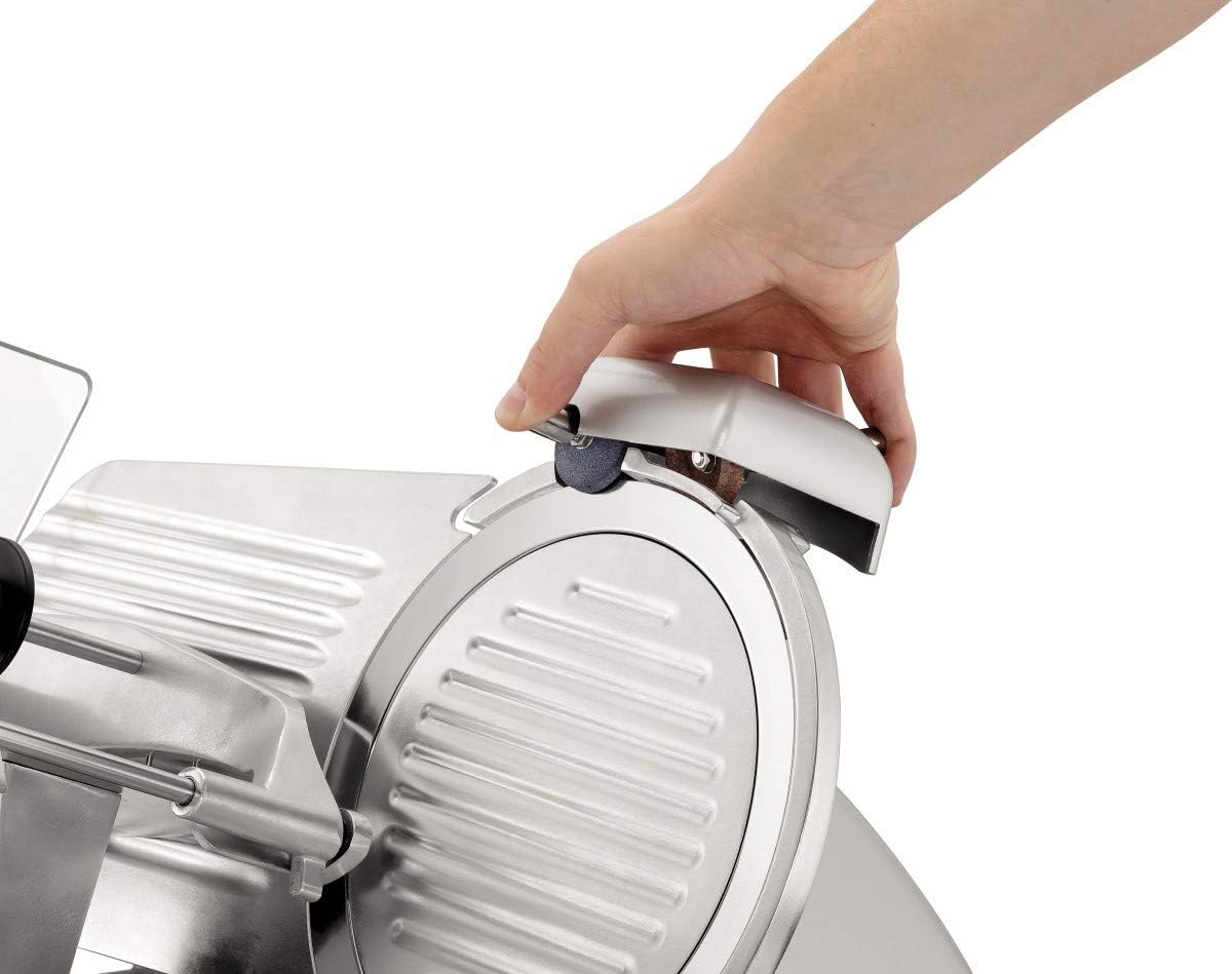 PRODUKTBESCHREIBUNGEN Mehr Sicherheit und Hygiene am Arbeitsplatz. Die Ausstattung der optimierten Aufschnittmaschine mit einem 250er Messer überzeugt durch technische Features in mehrfacher Hinsicht. Der leistungsstarke Schrägschneider verfügt über einen Restehalter, einen Messerschärfer, eine Aufschnittführung und um die Sicherheit zu gewährleisten einen zweifachen Messerschutz sowie einen Magnetschalter. * Gehäuse aus Aluminium * Schrägschneider mit Messerschärfer * Messer: Ø 250 mm, Drehzahl max. 190/min * Schnittlänge: 195 mm * Schnitthöhe: 140 mm * Schnittstärke: 1 - 12 mm * Anschlusswert: 140 W / 230 V * Masse: B 435 x T 510 x H 385 mm Mikrowelle: nicht geeignet Ausführung: Schrägschneider / Schwerkraftschneider Drehzahl max.: 190 U / Min. Ausgelegt für: Wurst Schutzart: IPX3 Länge Kabel: 1,4m Durchmesser Messer: 250 mm Schnittstärke: 1 - 12 mm Schnittlänge: 195 mm Schnitthöhe: 140 mm Mit Messerschärfer: ja Messerschutz: 2-fach Magnetschalter: ja Aufschnittführung: ja Restehalter: ja Ausführung Schlitten: Abnehmbar 2 Griffe Spannung: 230 V Frequenz: 50 Hz Kontrollleuchte: ja Ein-/Ausschalter: ja Steuerung: Knebel Material: Aluminium, Kunststoff, Plexiglas Artikelmasse: 51 x 43.5 x 38.5 Für dauerhaften gewerblichen Einsatz geeignet: ja