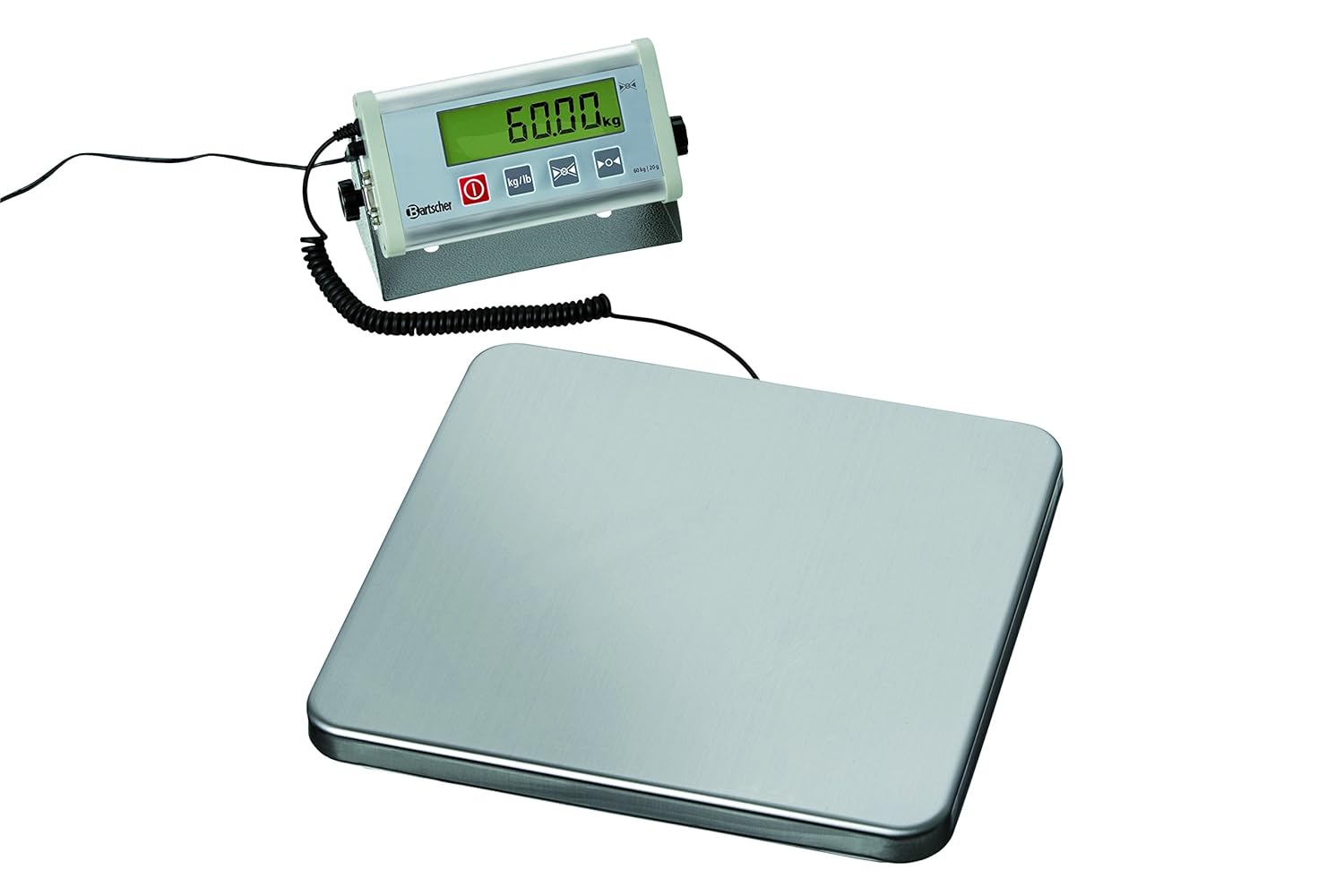 PRODUKTBESCHREIBUNGEN Betrieb über Netzteil oder Batterien. Fernanzeige für Wandmontage geeignet. Wendelleitung überbrückt eine Distanz von ca. 1,4 m (maximal). Geeignet für nicht eichpflichtige Wägungen. Edelstahl Wiegefläche: B 320 x T 300 mm Anschlusswert: 1,8 W / 230 V 50 Hz Masse: B 320 x T 300 x H 42 mm Wiegebereich bis 60 kg Teilung 20 g