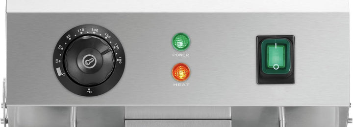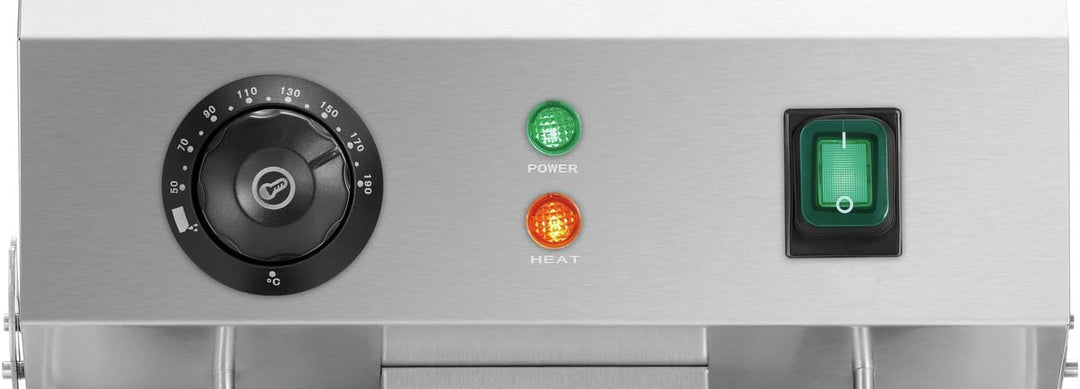 PRODUKTBESCHREIBUNGEN Die Fritteuse bereitet verschiedenste Snacks schnell und zuverlässig zu. Dank des praktischen Fett- ablasshahns und des schwenkbaren Heizelements ist auch die anschliessende Reinigung zügig erledigt. Eigenschaften: - Sicherheitsthermostat: Ja Tiefe Korb: 220 mm Füsse höhenverstellbar: Nein Breite Korb: 210 mm Anzahl Becken: 1 Anzahl Körbe: 1 Beckeninhalt: 9 Liter Korbinhalt: 5,5 Liter Betriebsart: Elektro Heizelement aus Edelstahl: Ja Geräte-Anschluss: Steckerfertig Heizelement: Herausschwenkbar Material: Edelstahl Ein-/Ausschalter: Ja Breite Becken: 240 mm Höhe Becken: 200 mm Fettablasshahn: Ja Frequenz: 50/60 Hz Tiefe Becken: 300 mm Inklusive: 1 Korb ,1 Deckel Typ: Tischgerät Fettauffangbehälter: Nein Temperaturbereich von: 50 °C Kontrollleuchte: Aufheizen ,Ein/Aus Farbe: Edelstahl Temperaturbereich bis: 190 °C Spannung: 230 V Höhe Korb: 120 mm Serie: - Kaltzone: Ja Steuerung: Knebel Anschlusswert: 3,3 kW Wichtiger Hinweis: Geeignet für Frittieröl und Stangenfett (Blockfett) Artikelmasse: 300 x 530 x 385 mm (B/T/H) Artikelgewicht: 6,2 kg