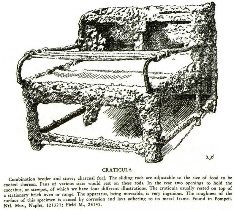 - Diese handgeschmiedete Nachbildung eines römischen Kochgestells aus Pompeji ist eine kleine handliche Feldküche mit zwei Kochplätzen für Töpfe und verschiebbaren Eisenstangen zum Abstellen von weiteren Kochgefässen.