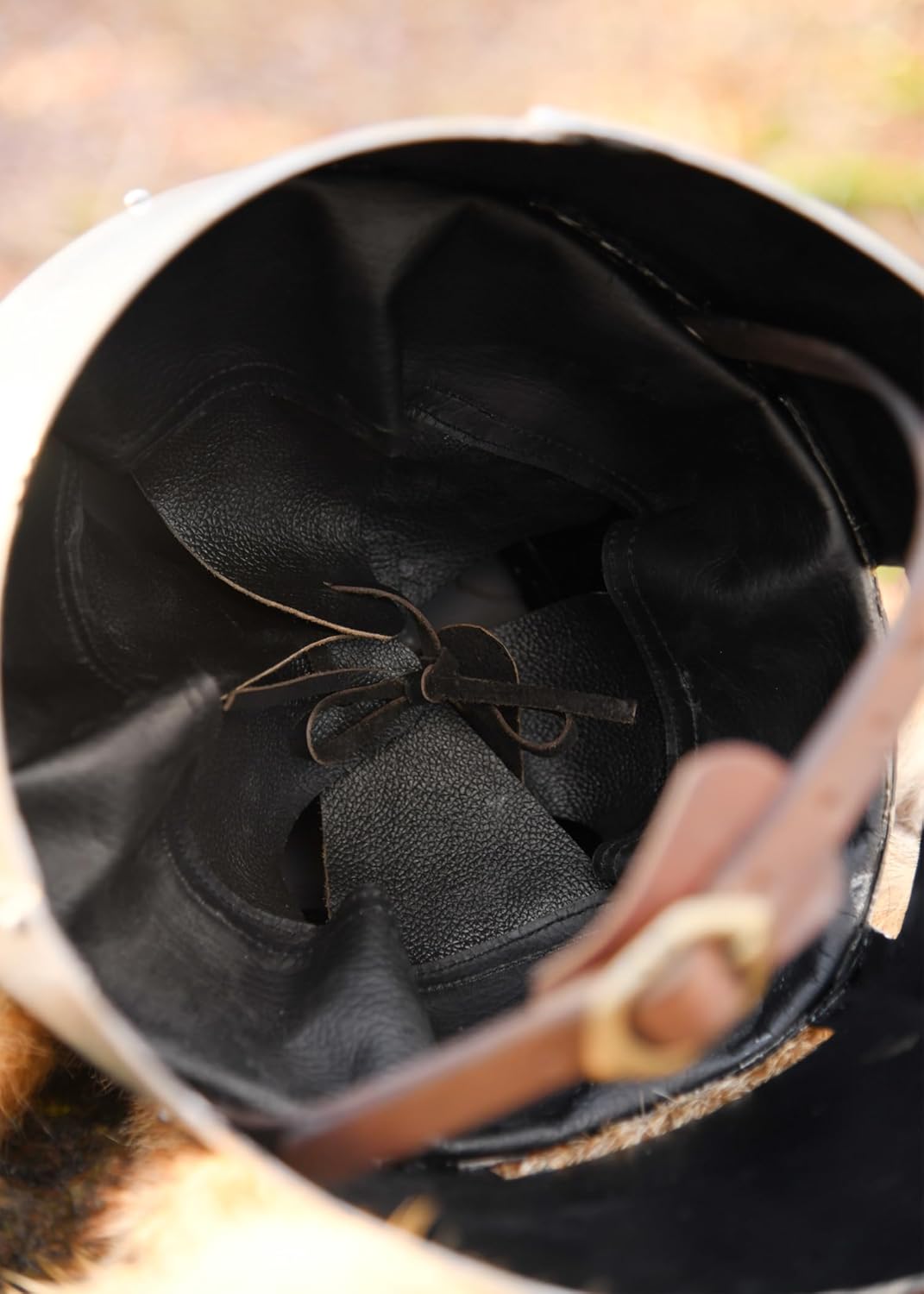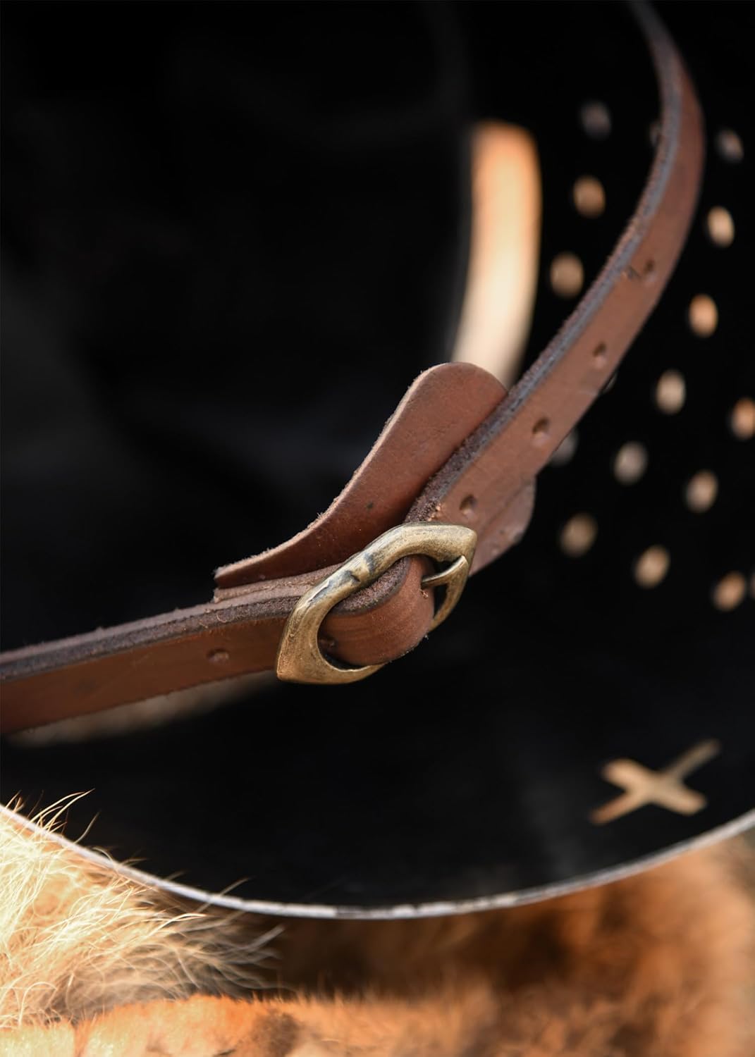 - Der Helm hat ein komfortables Lederinlet und Kinnriemen mit Messingschnalle.