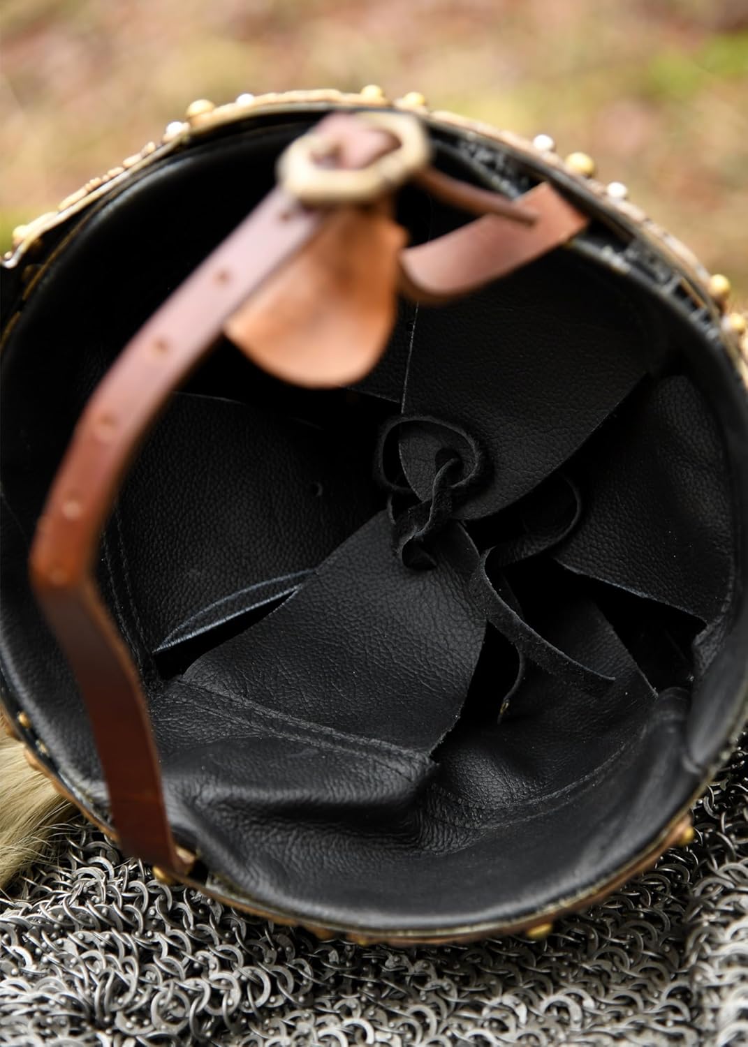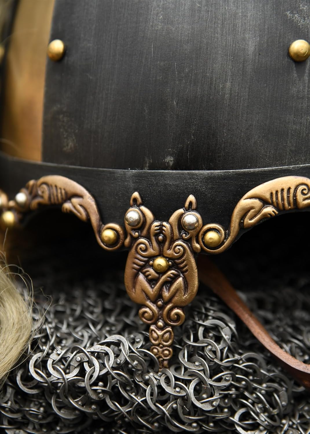 - Der untere Rand ist mit bronzierten Schmuckelementen im nordischen Stil verziert, ebenso das für diese Helmform typische Nasenschild