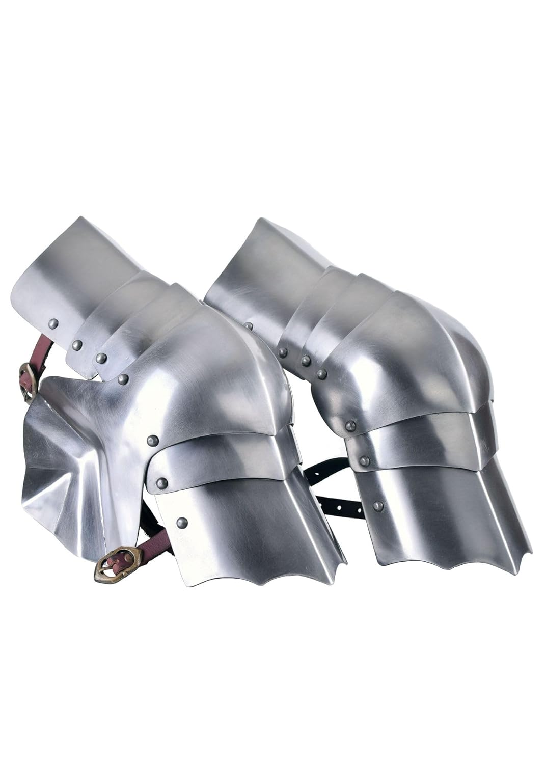- Diese tragbaren, mittelalterlichen Kniebuckel sind aus 1,3 mm Stahlblech handgetrieben.
