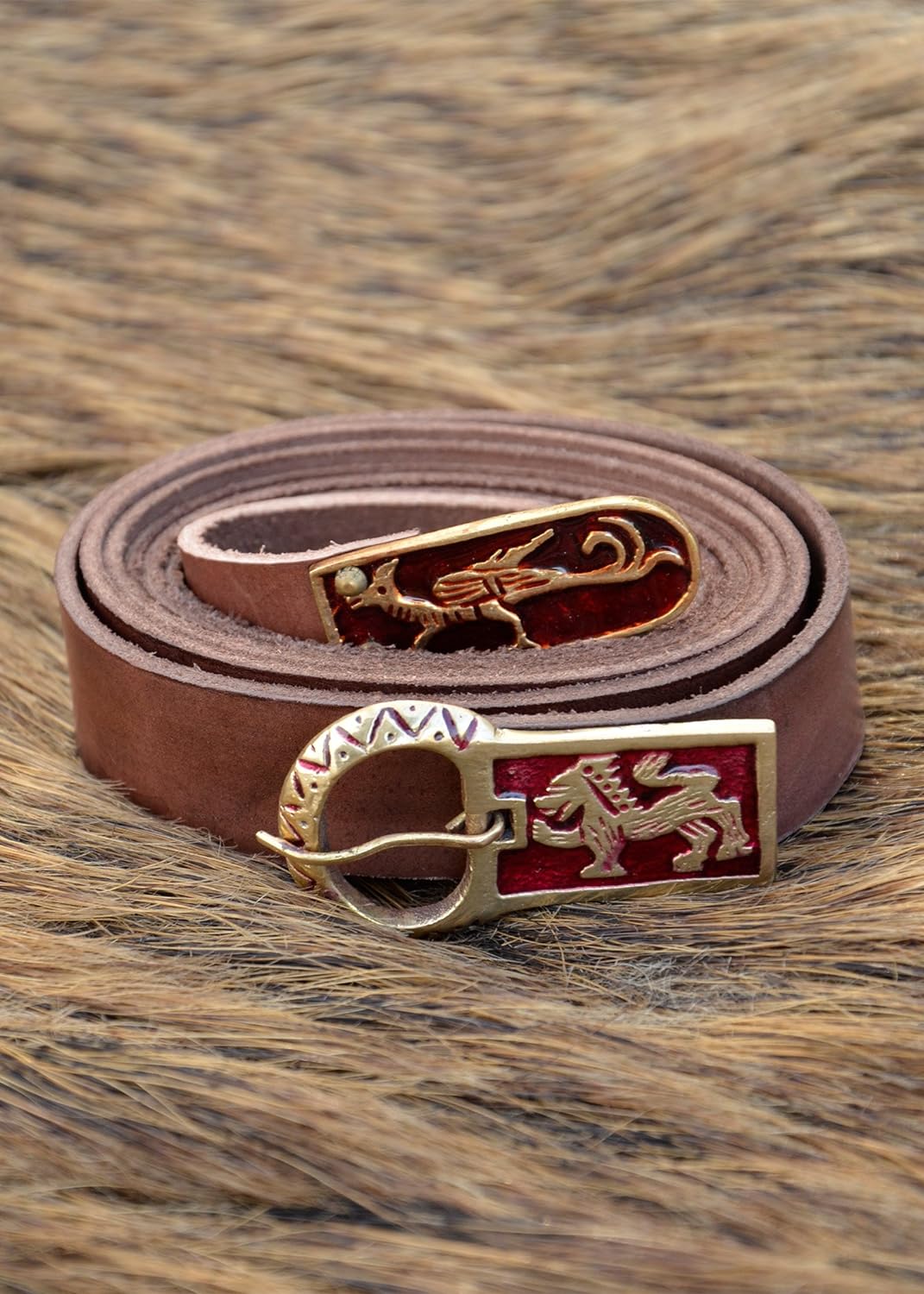 PRODUKTBESCHREIBUNGEN Mittelalter Langgürtel mit Greif und Löwenmotiv Nachbildung eines mittelalterlichen Ledergürtels mit angenieteten Messingbeschlägen. Die Schnalle des Gürtels wird von einem Löwen geziert, der Endbeschlag von einem Greif, einem mittelalterlichen Fabelwesen. Er ist extra lang und somit für die mittelalterliche Knotentrageweise geeignet. Details: - Länge: ca. 165 cm - Breite: ca. 2,6 cm - Material: Rindsleder ca. 3,5 mm dick, Messingbeschläge