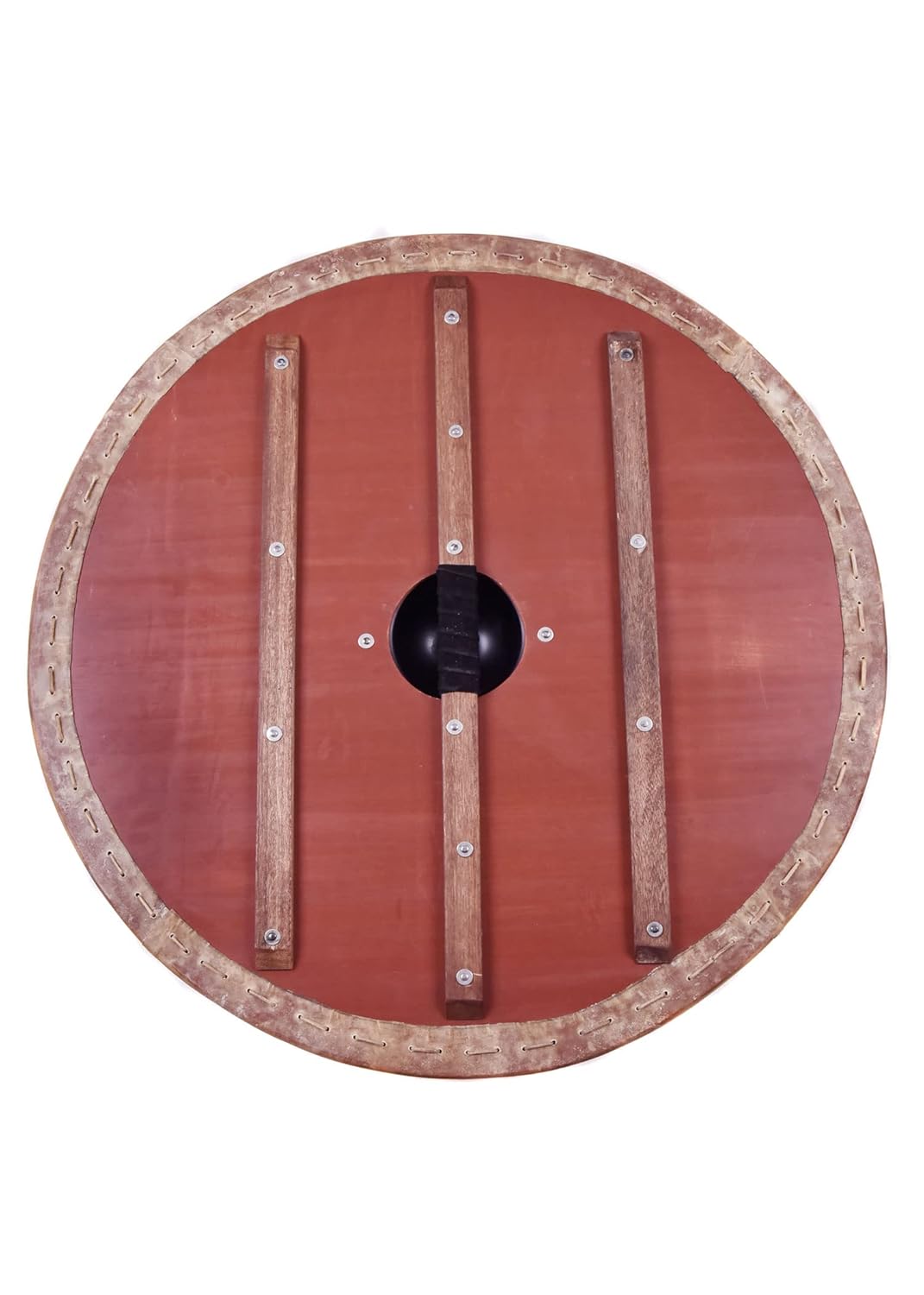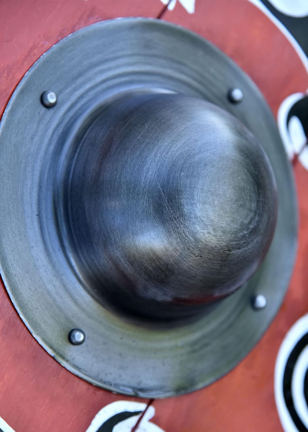 - STAHLBUCKEL: Mittig vom am Schild ist ein Stahlbuckel angebracht, der mit vier Nieten fixiert ist und genug Platz für kräftige Wikingerhände bietet. Auf der Rückseite befinden sich drei vernietete Verstärkungsleisten aus Holz, von denen die mittlere