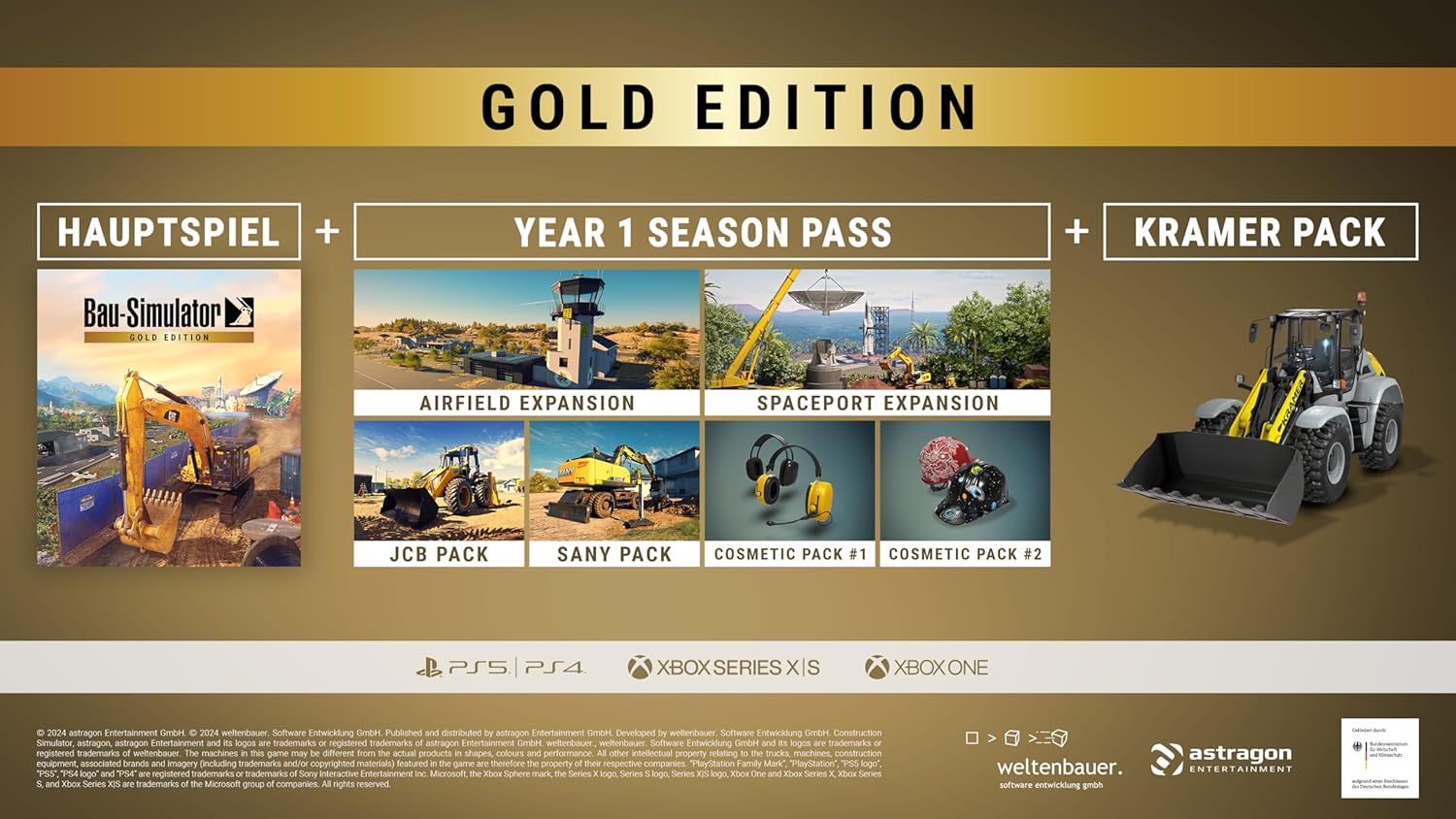 - Freue dich auf umfangreichen Bau-Spass in der Bau-Simulator Gold Edition: enthält das Hauptspiel, den Year 1 Season Pass und das Kramer Pack