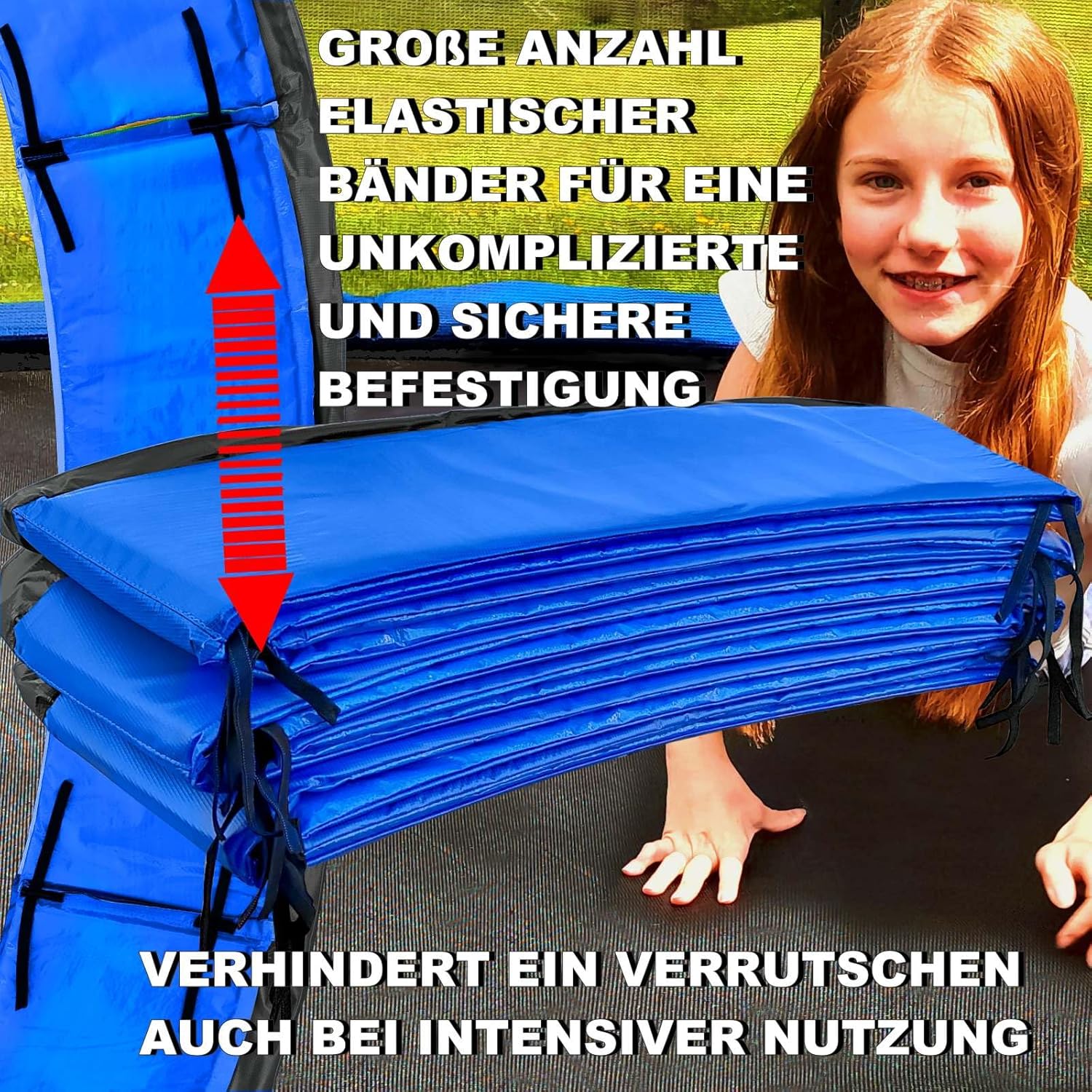 - UV-beständig und farbecht, mit elastischen Bändern zur einfachen, sicheren Befestigung am Trampolin.