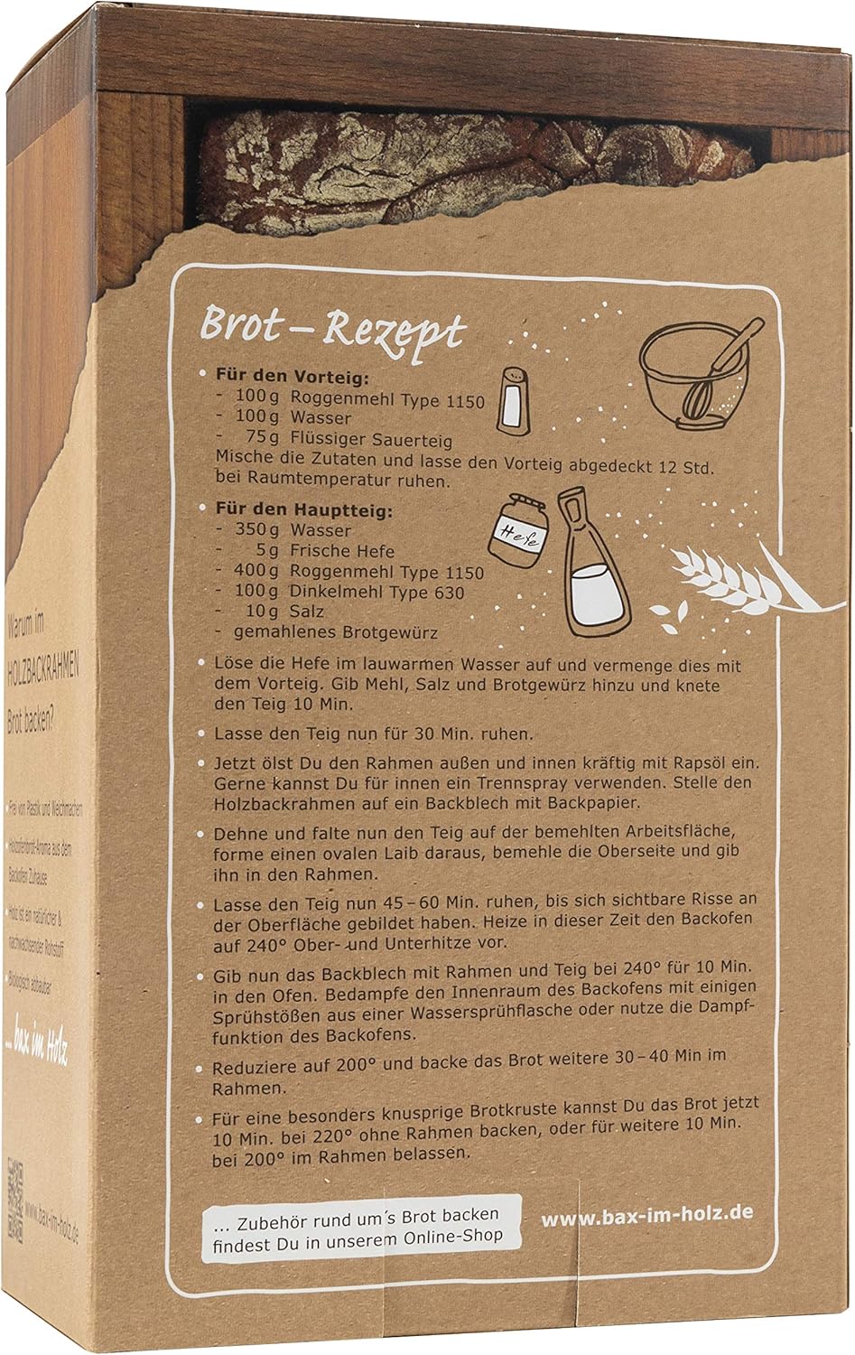 - Bax im Holz - Der Brot-Holzbackrahmen wird mit einer ausführlichen Anleitung und einem persönlichen Rezept geliefert