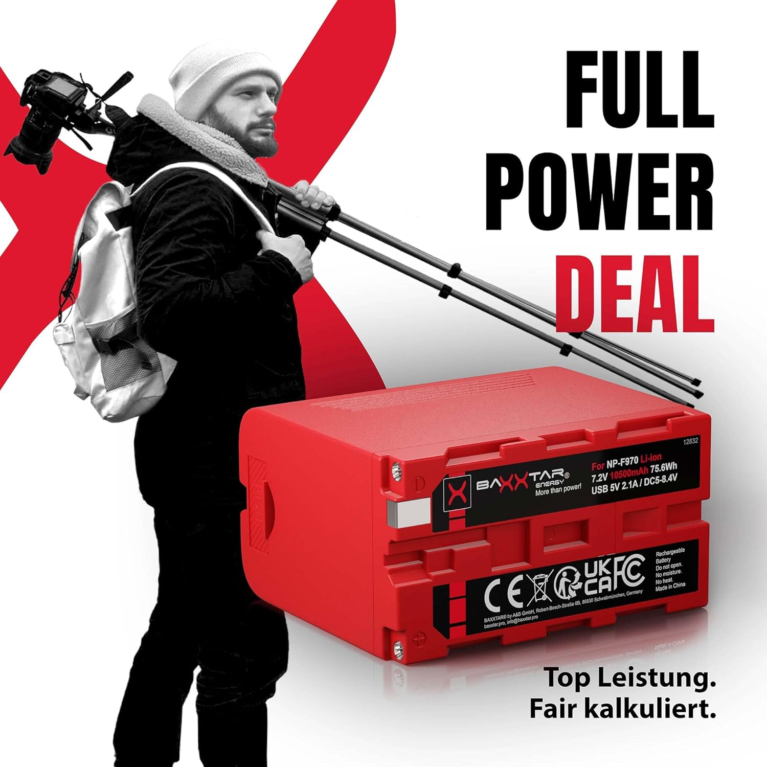 - Der Baxxtar NP-F970 Plus, unterscheidet sich teils stark vom herkömmlichen NP-F970 Akku (auch in den Abmessungen), durch 1. Dramatische Leistungssteigerung auf 10.500mAh 2. Zertifizierte Lithium Ionen Flach-Zellen von LG (kompakte Bauweise)
