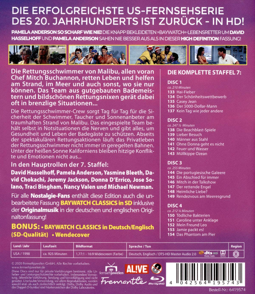PRODUKTBESCHREIBUNGEN Die Rettungsschwimmer von Malibu, allen voran Chef Mitch Buchannon, retten Leben und helfen am Strand, im Meer und auch sonst, wo sie nur können. Das Team aus gutgebauten Bademeistern und bildschönen Rettungsnixen gerät dabei oft in brenzlige Situationen... Die komplette 7. Staffel (22 Folgen) auf 4 Blu-rays: 133 Hai-Fieber 134 Der Schönheitswettbewerb 135 Casey Jean 136 Der 5000-Dollar-Mann 137 Kein Tag wie jeder andere 138 Die Beachblast-Spiele 139 Lieber Besuch 140 Männer aus Stahl 141 Ohne Donna geht es nicht 142 Feuer und Wasser 143 Müllkippe Ozean 144 Die Portugiesische Galeere 145 Ein Abschied für immer 146 Mitch in der Talkshow 147 Der rettende Engel 148 Heimliche Liebe? 149 Rendezvous am Meeresgrund 150 Tödliche Bakterien 151 Caroline unter Anklage 152 Jamie packt es! 153 Das Phantom am Pier 154 Mein Freund Leo Bonusmaterial: Wendecover; Baywatch Classics in Deutsch/Englisch;