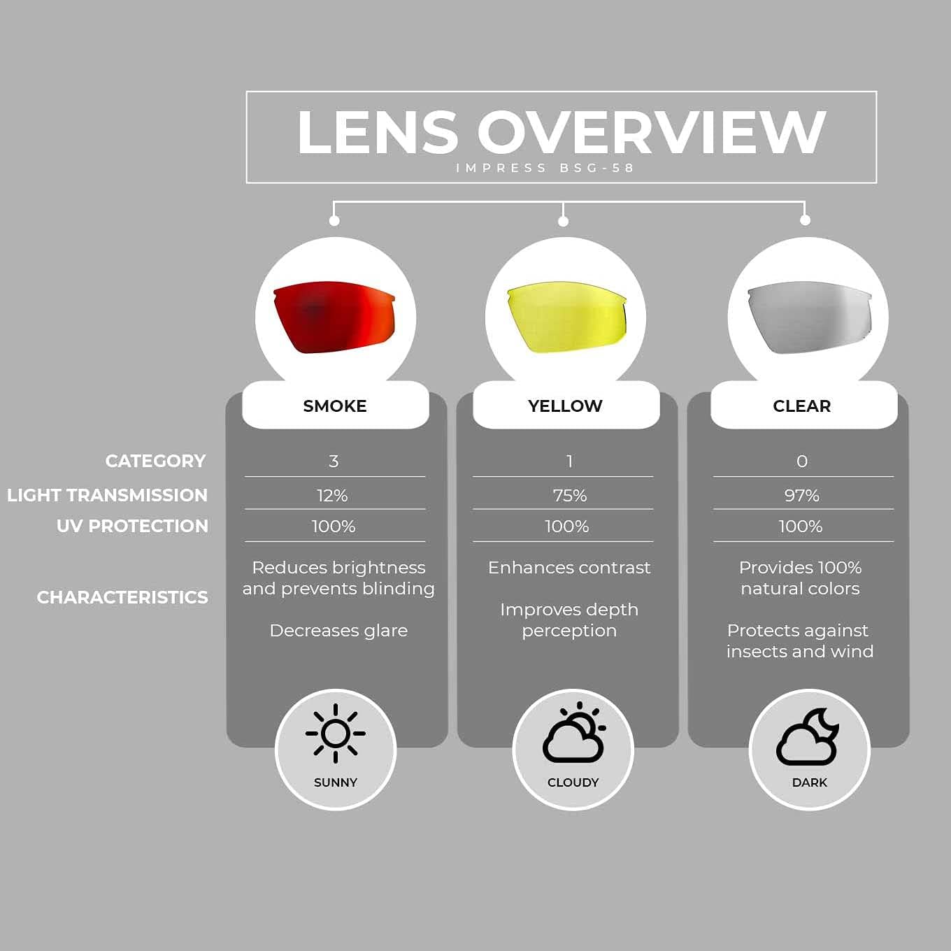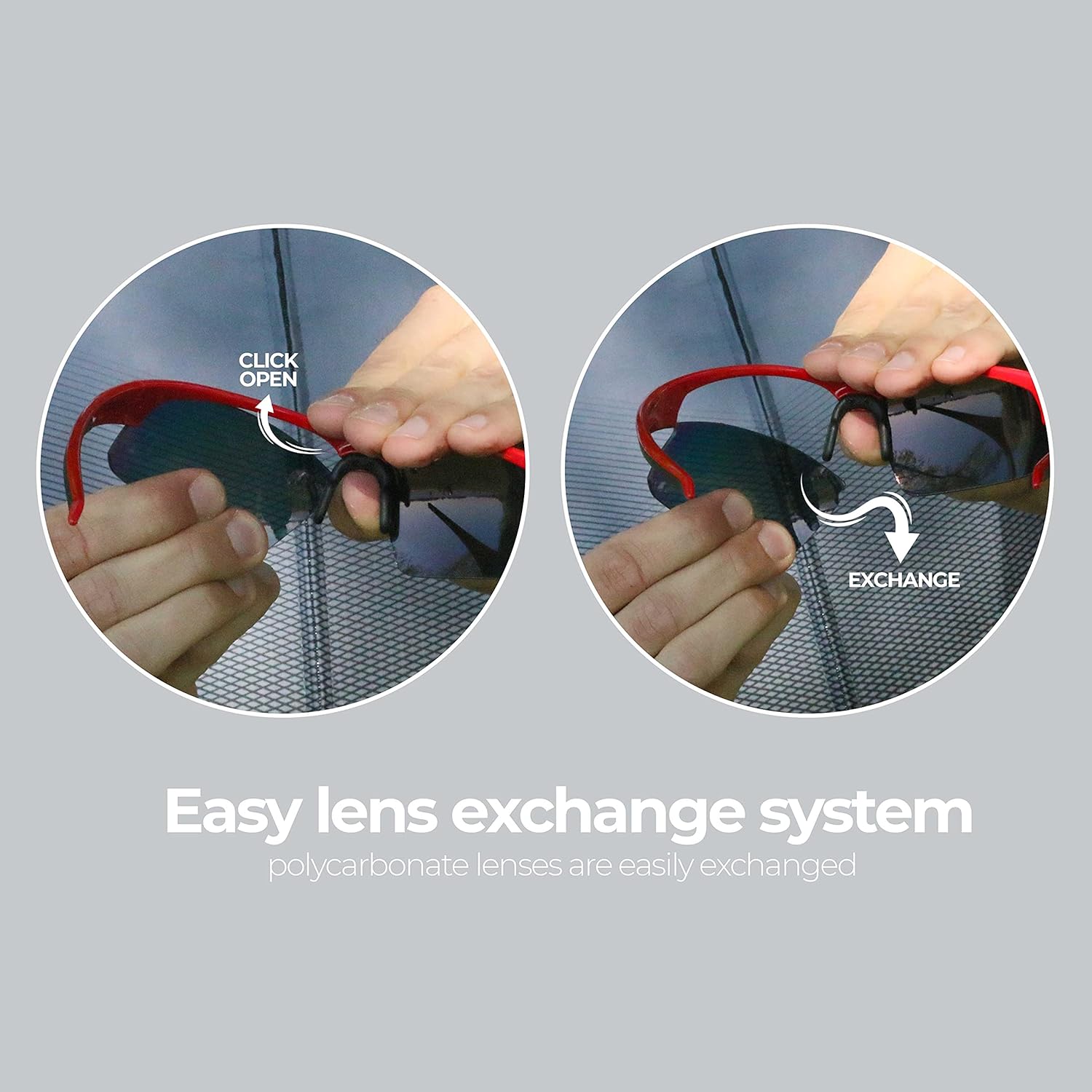 • Die Sportbrille wird zusätzlich mit gelben und klaren Wechselgläsern geliefert, um eine optimale Anpassung an alle Lichtverhältnisse und Wetterbedingungen zu bieten