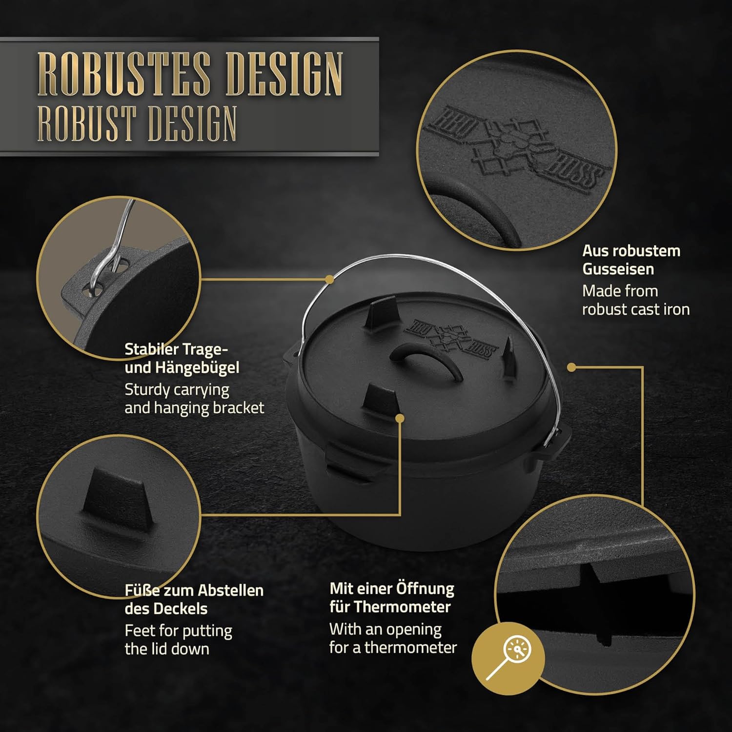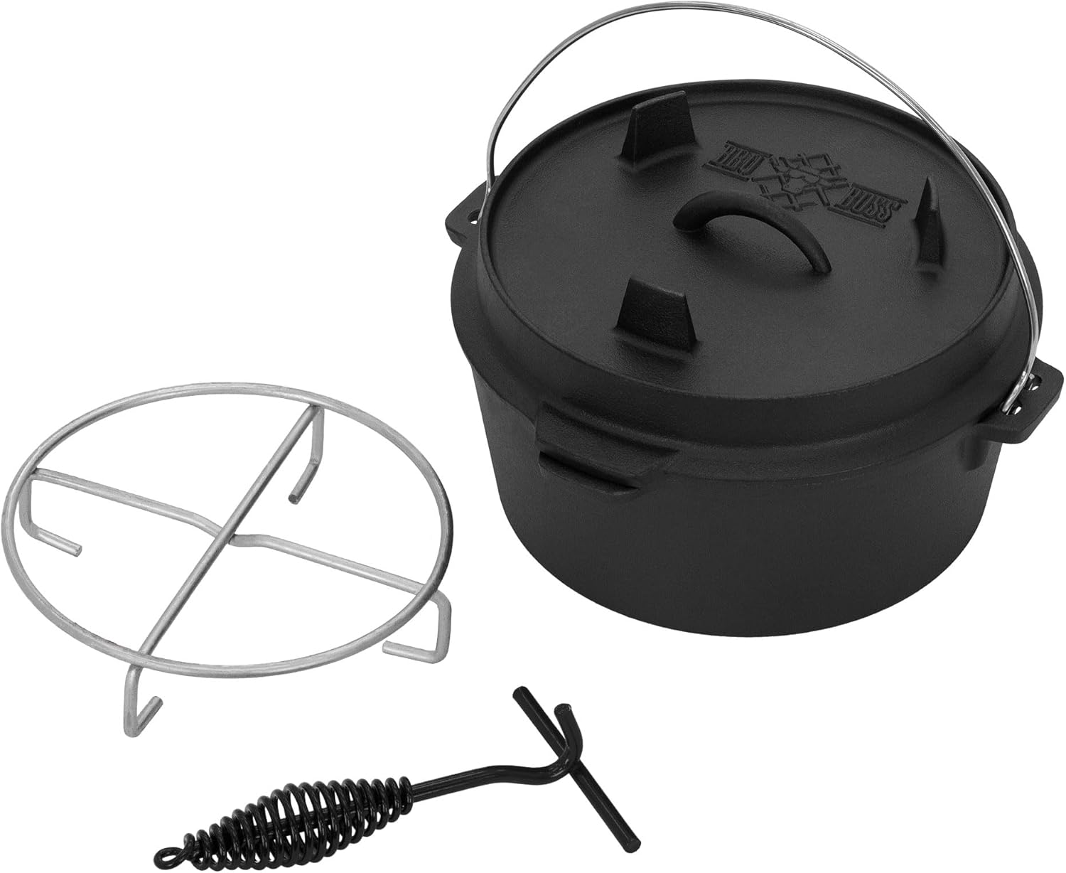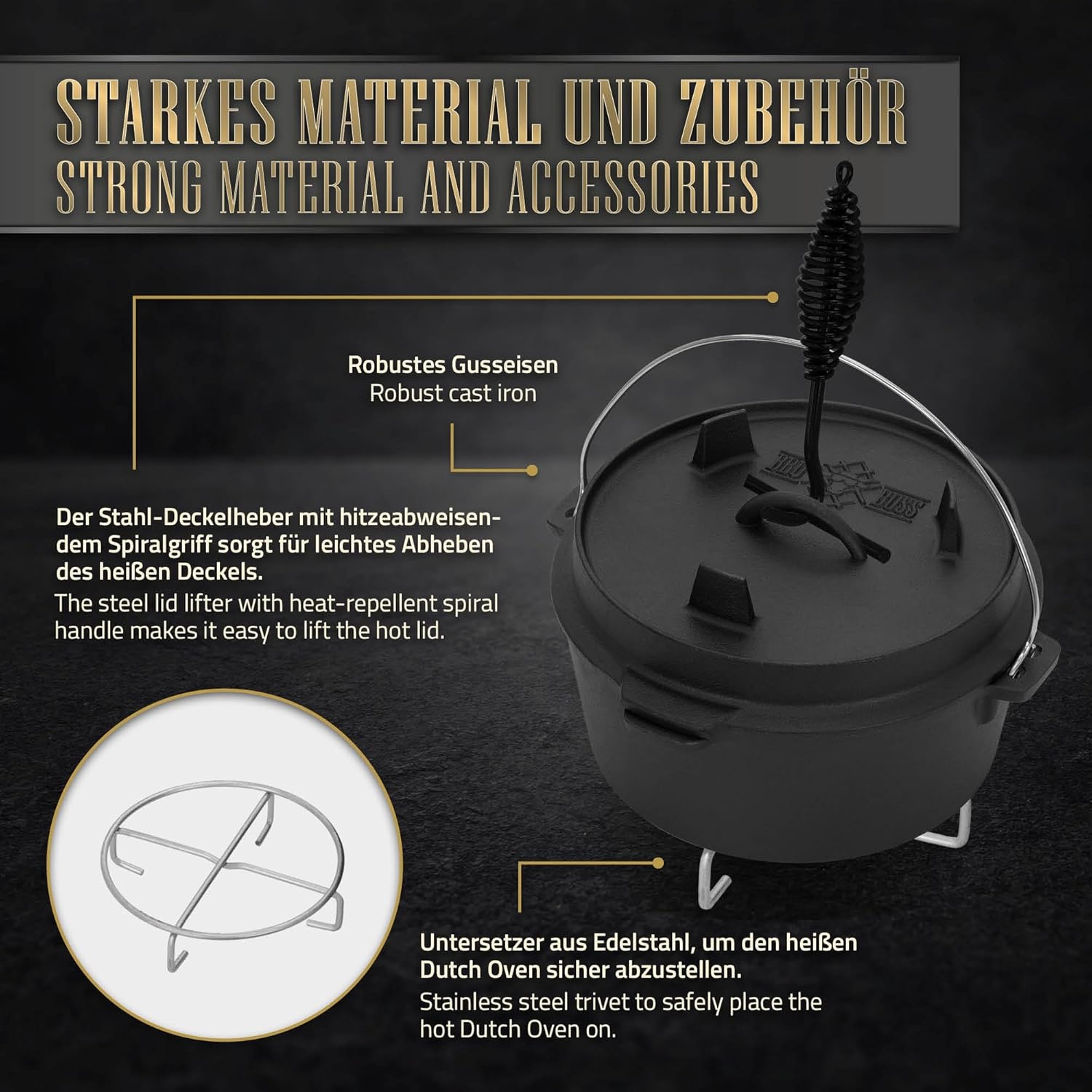 - SOFORT EINSATZBEREIT - Mit diesem Dutch Oven Set können Sie direkt loslegen! Der premium Gusseisen Topf ist fertig eingebrannt und einem leckeren Gericht aus dem Grilltopf steht nichts mehr im Wege. Das voreingebrannte Gusseisen sorgt für eine