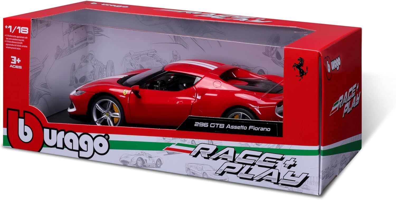 - Detailgetreu in Rot-Weiss präsentiert sich der Ferrari 296GTB Assetto Fiorano in der Race & Play Edition von Bburago