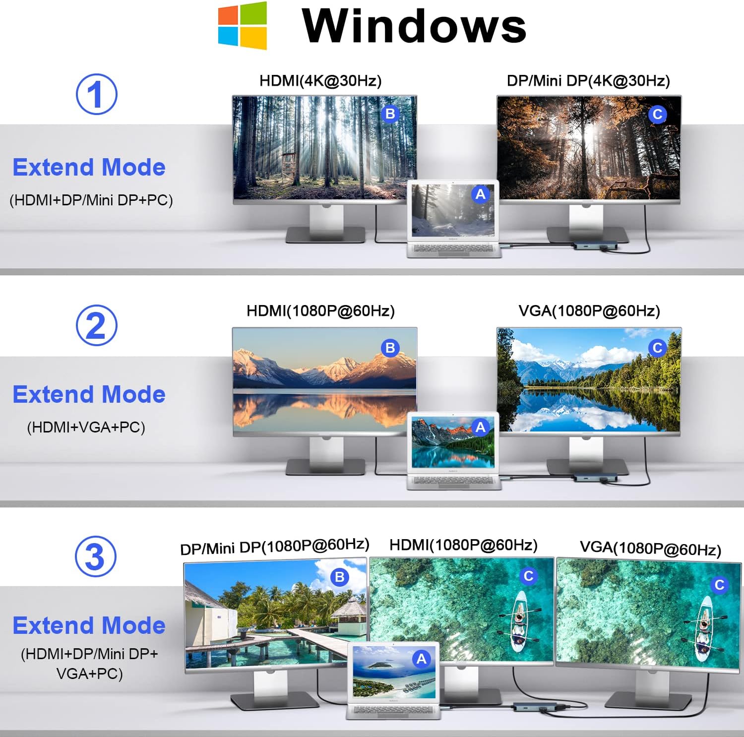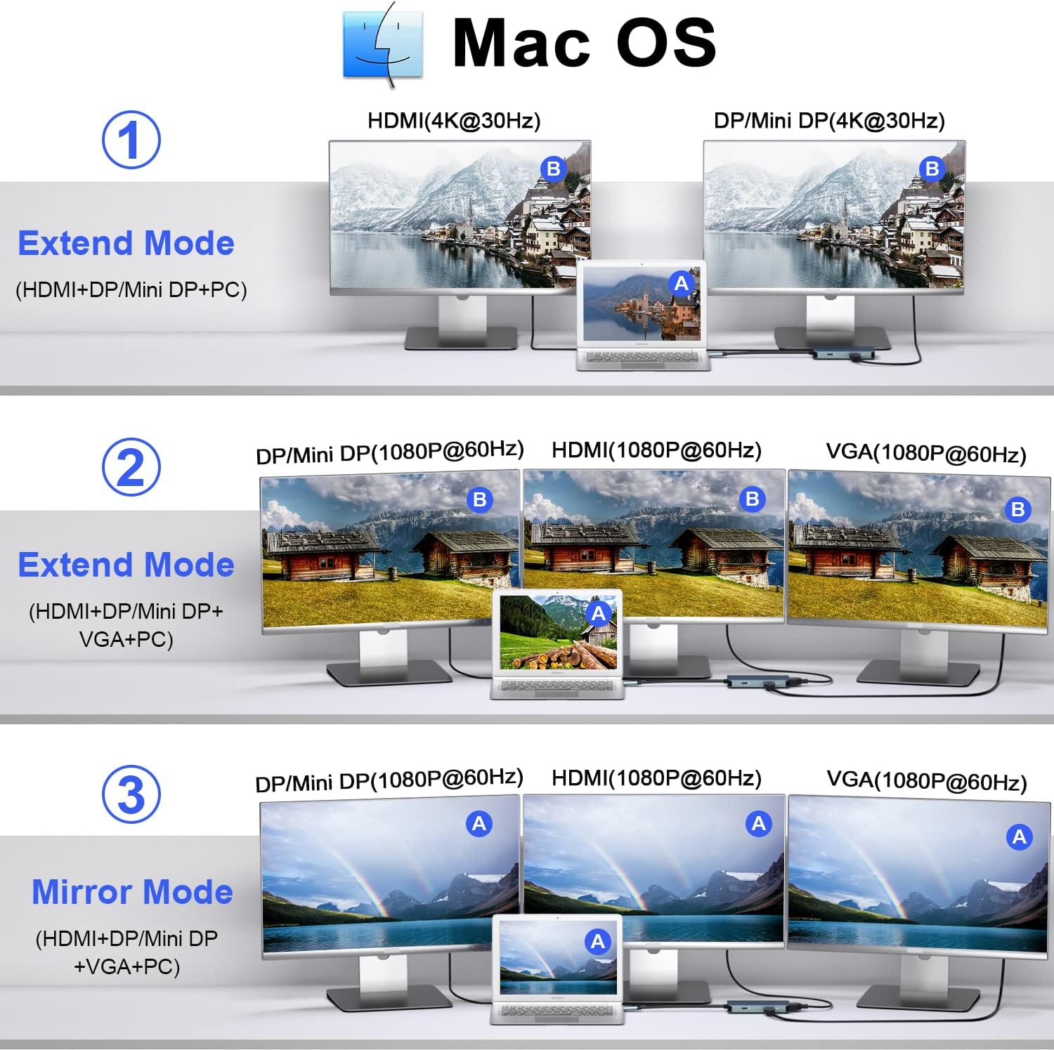 - 【Erweiterter Modus】 Windows-System unterstützt 3 verschiedene Anzeigemodi, Laptop-Anzeige A-Bildschirm, HDMI- und VGA-Anschlussanzeige B, DP- und Mini-DP-Anschlussanzeige C. Mac OS-System unterstützt keine MST-Anzeige, unterstützt nur Spiegelmodus