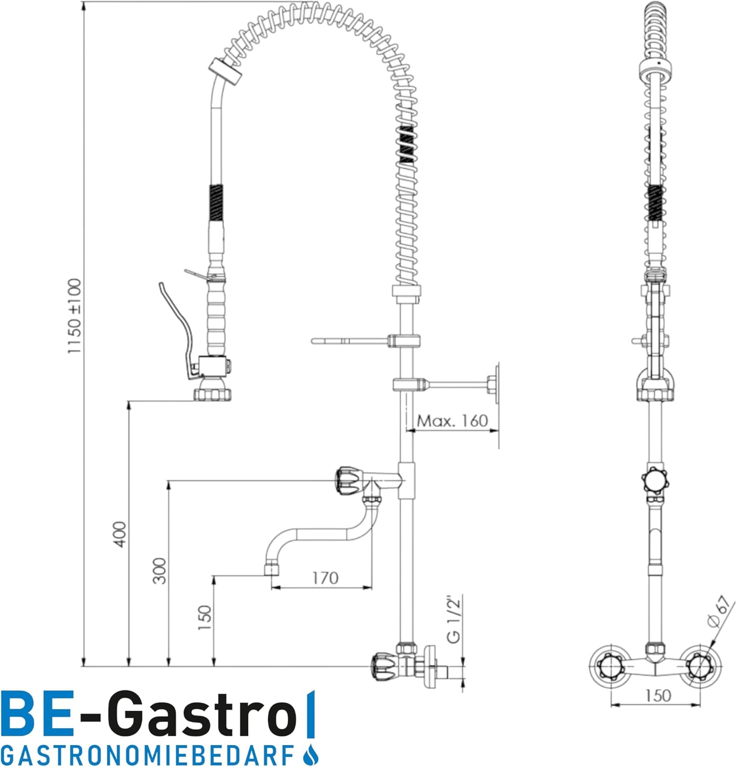 BE-GASTRO I Profi Gastro Geschirrbrause Zweiloch "Premium" Wandarmatur inkl. Wasserhahn, Mischbatter