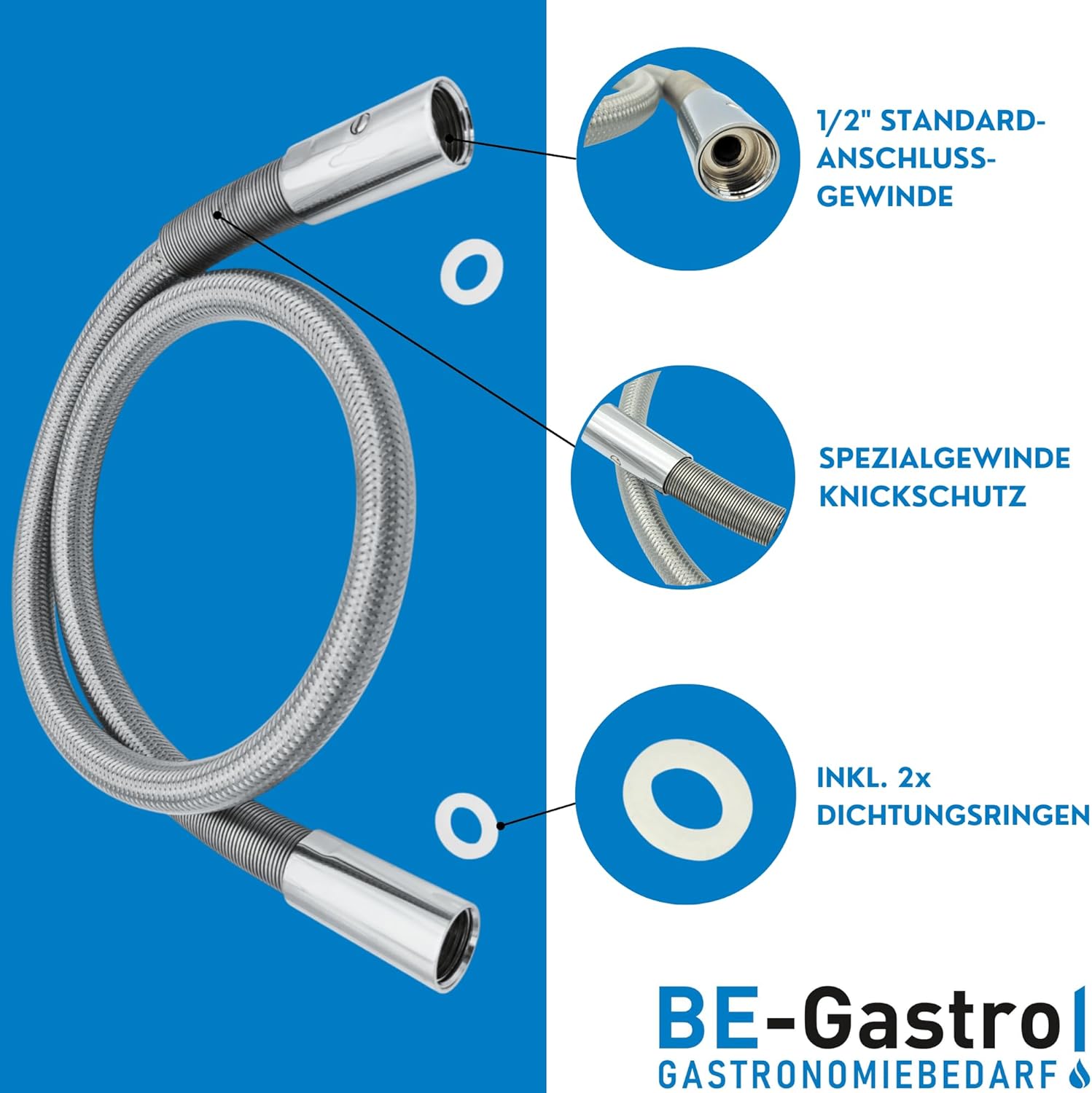 BE-GASTRO I Profi Gastroschlauch Brauseschlauch 120cm inkl. Spezial-Knickschutz | 1/2" Standard-AG |