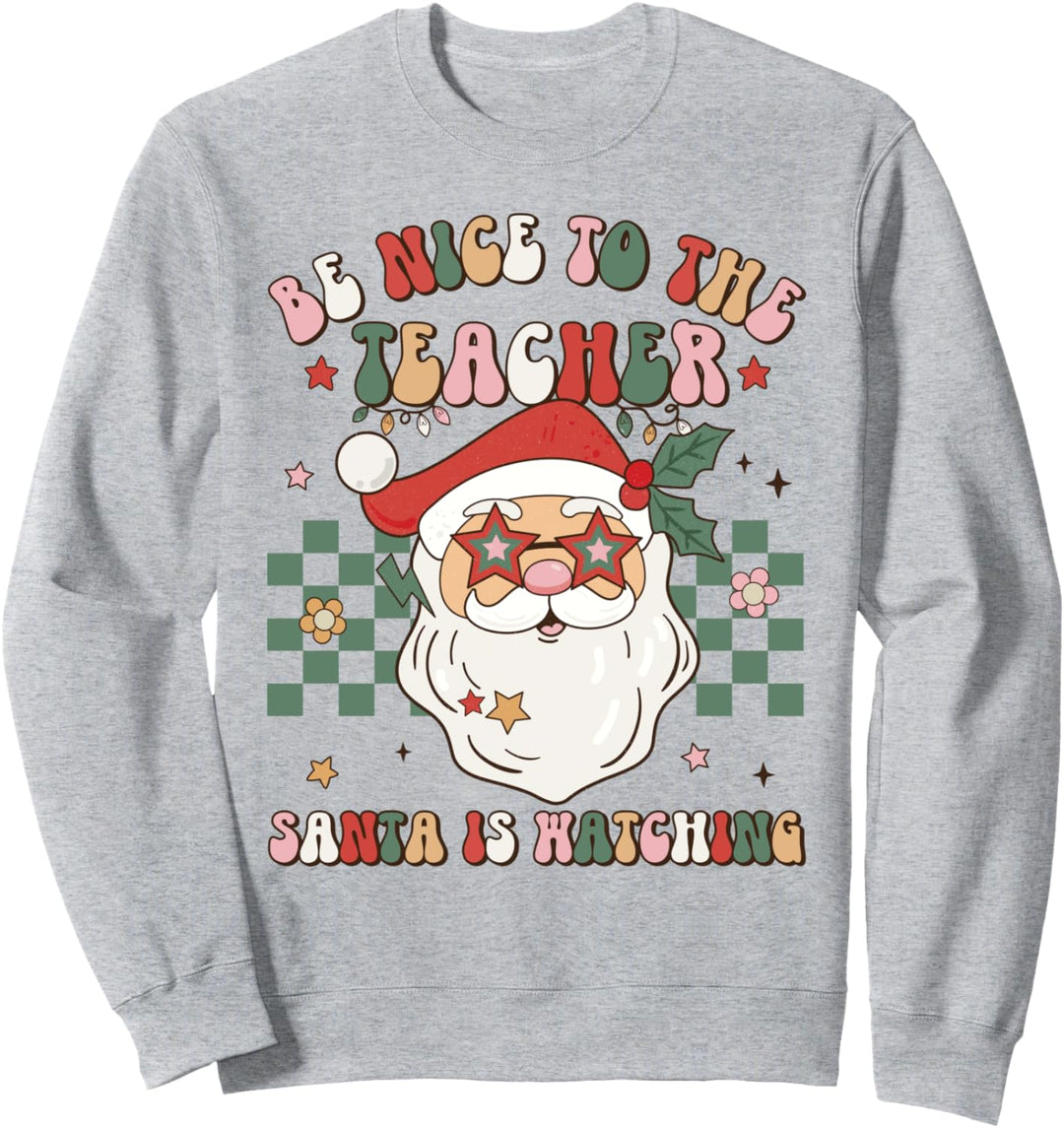 PRODUKTBESCHREIBUNGEN Be Nice To The Teacher Santa Is Watching Funny Xmas Shirt For teacher, elementary teacher, high school teacher, college teacher, 1st 2nd 3rd 4th 5th grade teacher, dyslexia teacher, SPED teacher, ESL teacher, pre school teacher, Physical Education teacher. Retro Christmas 2022 present for teachers, men, women, mom, dad, mama, papa, principal, administrator, lunch lady, and educators who believe in Santa Claus. Funny Christmas present for the Tree Lights, at the Party, in Stockings stuffer or accessories.