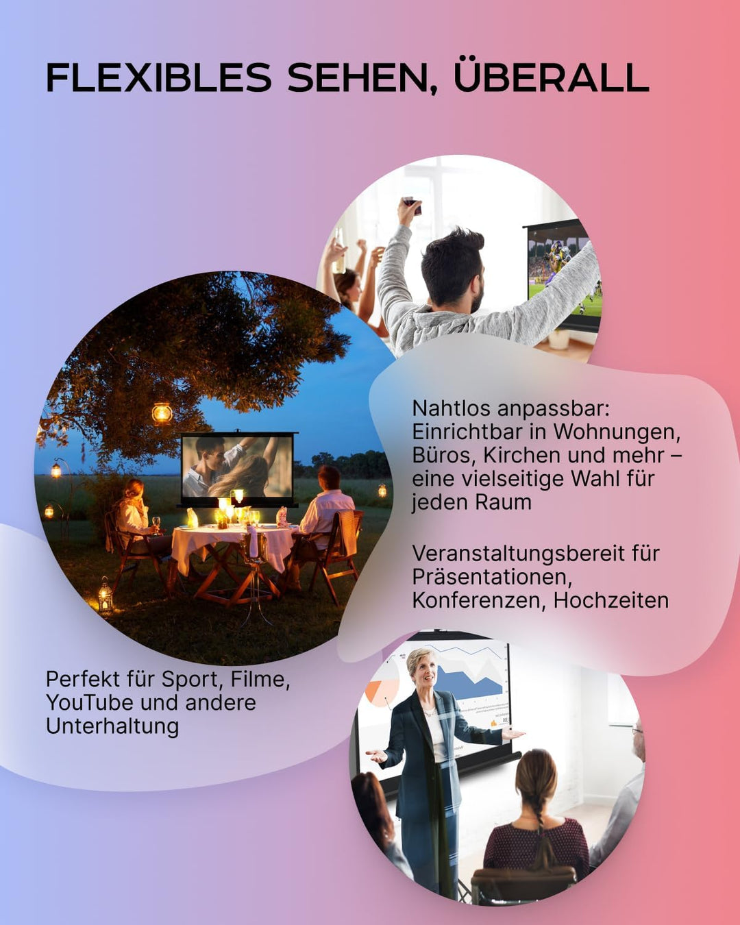 - Die tragbare Leinwand kann an jedem Ort verwendet werden: zu Hause, in der Schule, im Büro, im Klassenzimmer, im Garten, für Präsentationen, Konferenzen, Hochzeiten und vieles mehr.